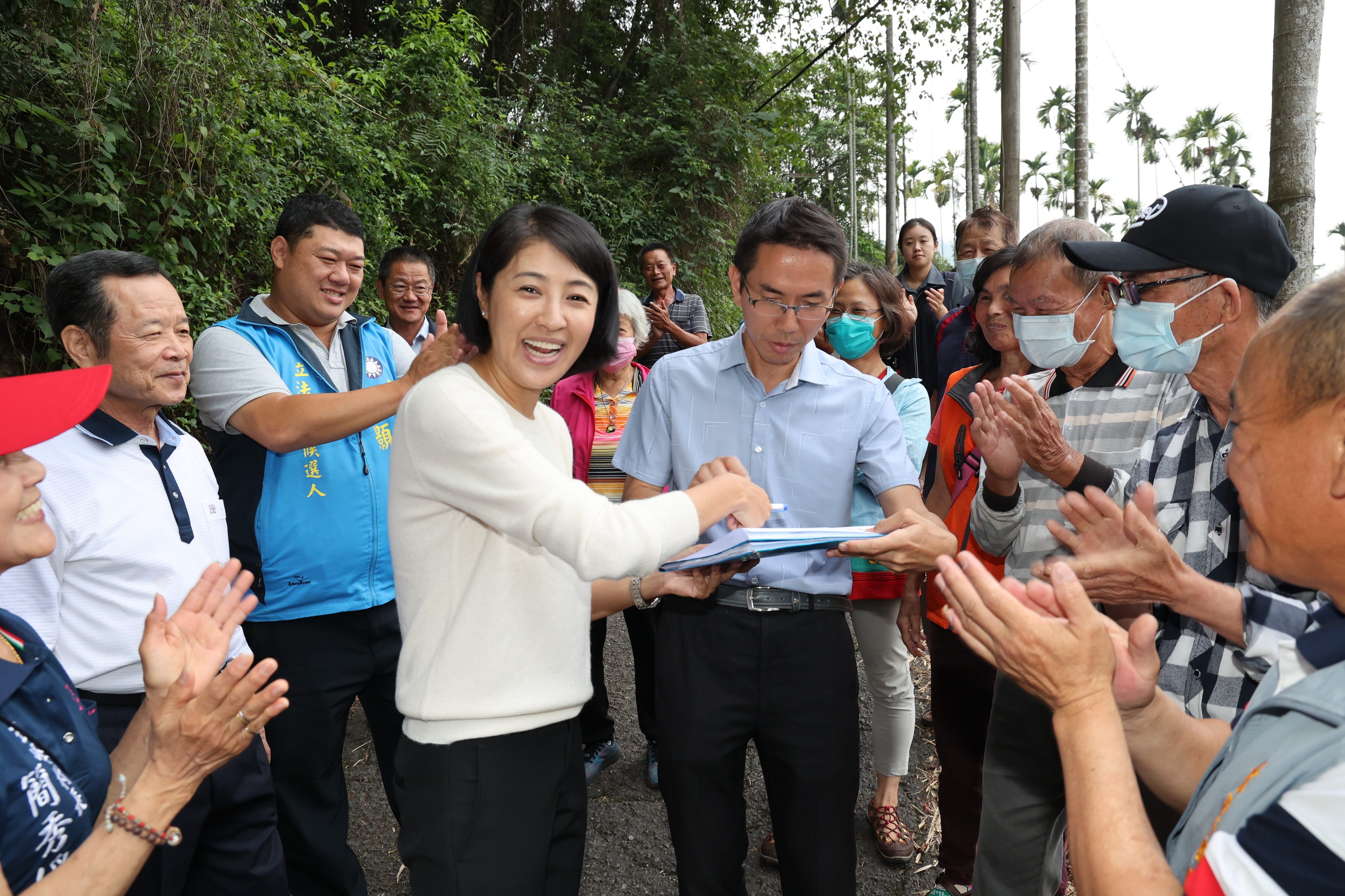 許縣長指出,包括水里鄉郡坑村一廍路產業道路改善工程120餘萬元,連通新山村的信義鄉人和村新倫路支線農路改善工近140萬元,興隆村興安橋護欄及白不仔道路改善工程120餘萬元,她在新山村活動中心和陳情民眾面對面研究後,都當場簽核同意,責由道養科加速辦理發包。