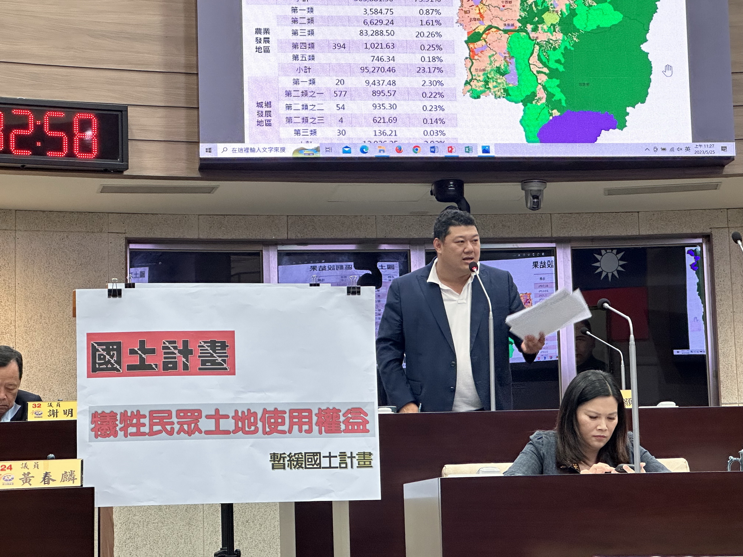 縣長許淑華25日出席縣議會第20屆第一次定期會縣政總質詢,就議員共同質詢國土計畫法犧牲民眾土地權益,呼籲中央暫緩公告議題,與議員陳淑惠、簡峻庭、謝明謀、林憶如、游顥、李洲忠、林婷立、廖梓佑共同發聲,籲請中央暫緩於114年公告國土計畫法,俟廣納民意,修正窒礙難行規定,並完善相關配套後再行擇期公告實施,保障民眾土地權益及生計。