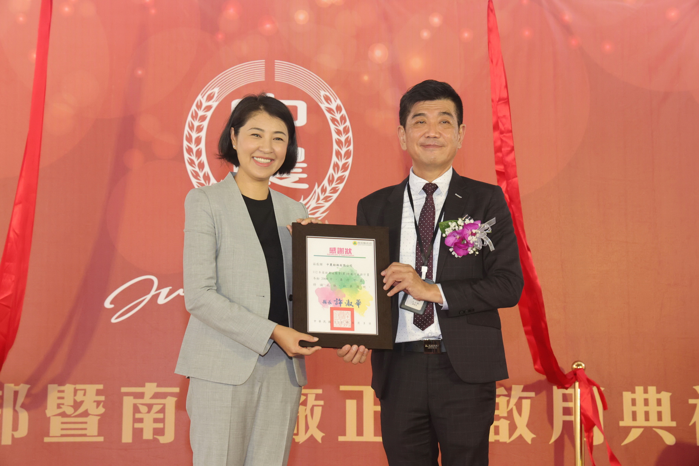 縣長許淑華3日上午出席「中農粉絲有限公司-營運總部暨南崗廠正式啟用典禮」,並就該公司捐贈2,000 斤冬粉幫助本縣弱勢及邊緣戶家庭,頒贈感謝狀,表達感謝之意,由董事長王天實代表接受,儀式簡單隆重。縣議員林儒暘、簡千翔、游顥、南投市長張嘉哲、台中市議員李中、南崗廠協會理事長粘清泉及各界貴賓出席觀禮,場面熱鬧。