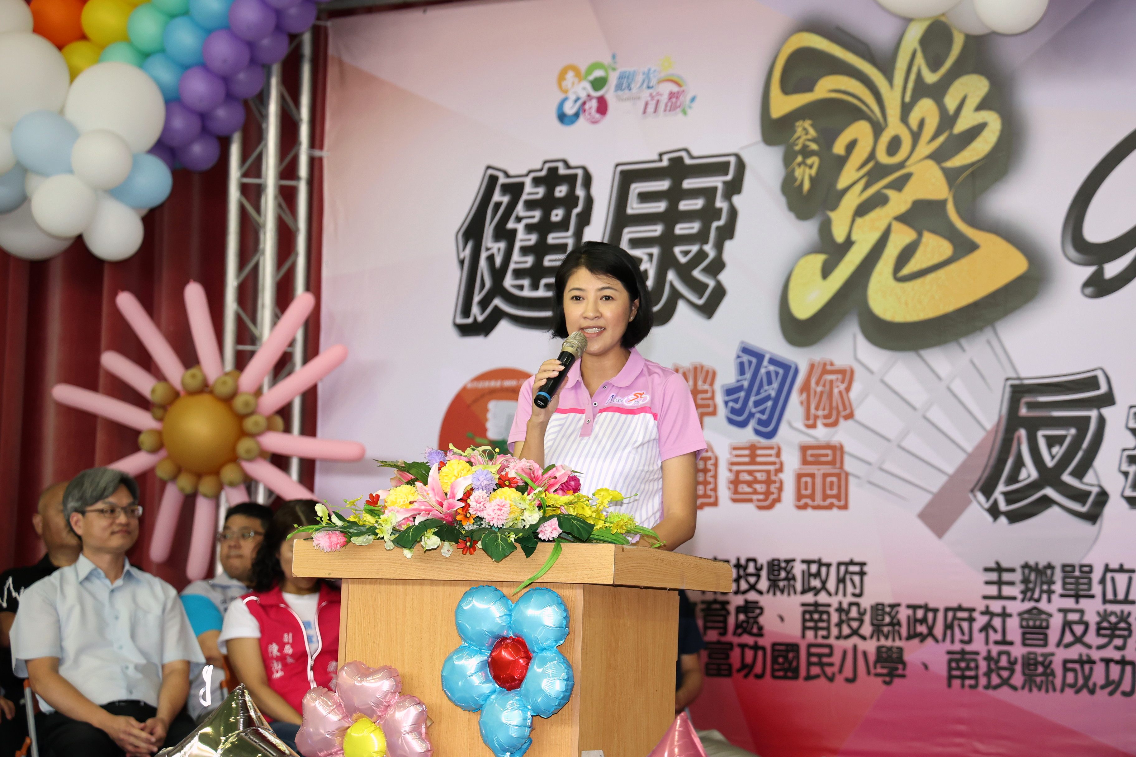 縣長許淑華致詞表示,去年辦理第一屆反毒羽球賽,引起廣大熱烈迴響,今年擴大辦理,鼓勵更多人參與。透過毒防中心各單位不斷的努力,南投縣藥癮者盛行率自107年起逐年下降,107 年到 111 年南投縣藥癮人數降低了 4 分之 1,更是大家共同努力獲致的豐碩成果,但根據數據統計,藥癮者年齡層分布卻也有年輕化的趨勢。因此希望透過透過羽球競賽及現場各項闖關遊戲,增進親子、學童同儕間互動,強化家庭支持,將防毒、反毒的力量深化入家庭社會,以遏止毒害年輕化的趨勢,接下來暑假將至,呼籲學生們面臨各種活動聚會把握「不好奇、不嘗試」的原則,拒絕來路不明的物品,遠離毒害。