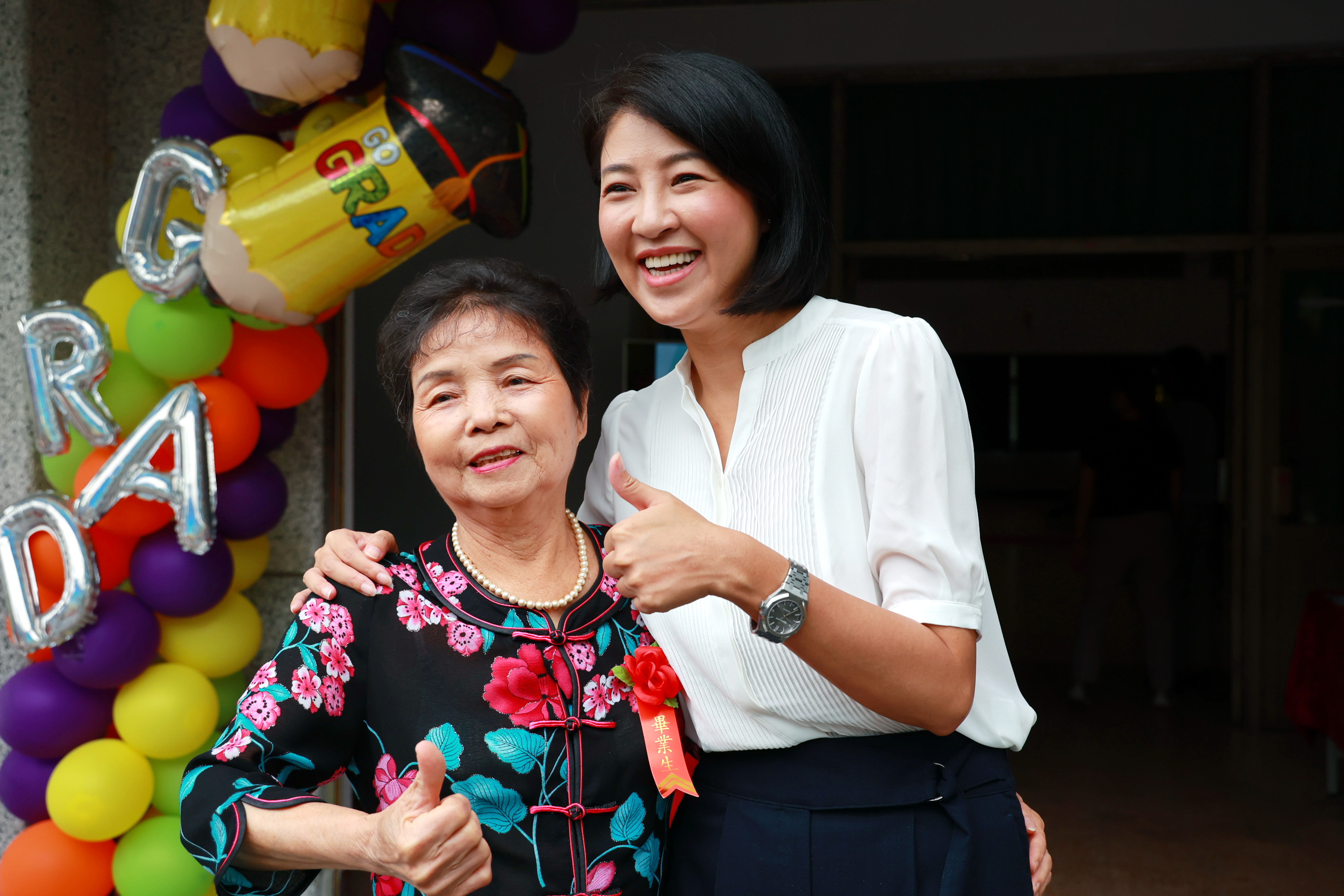 許縣長到場後也親自頒發縣長獎給3位應屆畢業生,並與補校的8位畢業生合影留念。許縣長表示,這是她今年參加的第一場學校的畢業典禮,要送上誠摯的祝福給所有畢業生,她是聽到鄉長邱美玲的轉述,才知道有一位高齡80歲的畢業生,就覺得一定要來為這位阿嬤級的學生加油打氣。