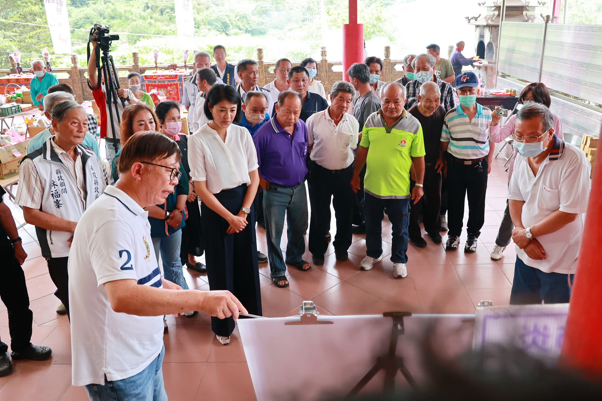 至於南港村豐湖道路及双溪路道路工程改善計畫,許縣長則邀請鄉親到五穀宮廟埕前進行說明簡報,許縣長表示將會進行這兩條道路的路面改善工程,施作各約200公尺長PC路面,作為農路使用,受益面積約為60公頃,方便農民進出耕作及農產運輸便利,概估工程經費約156萬元。