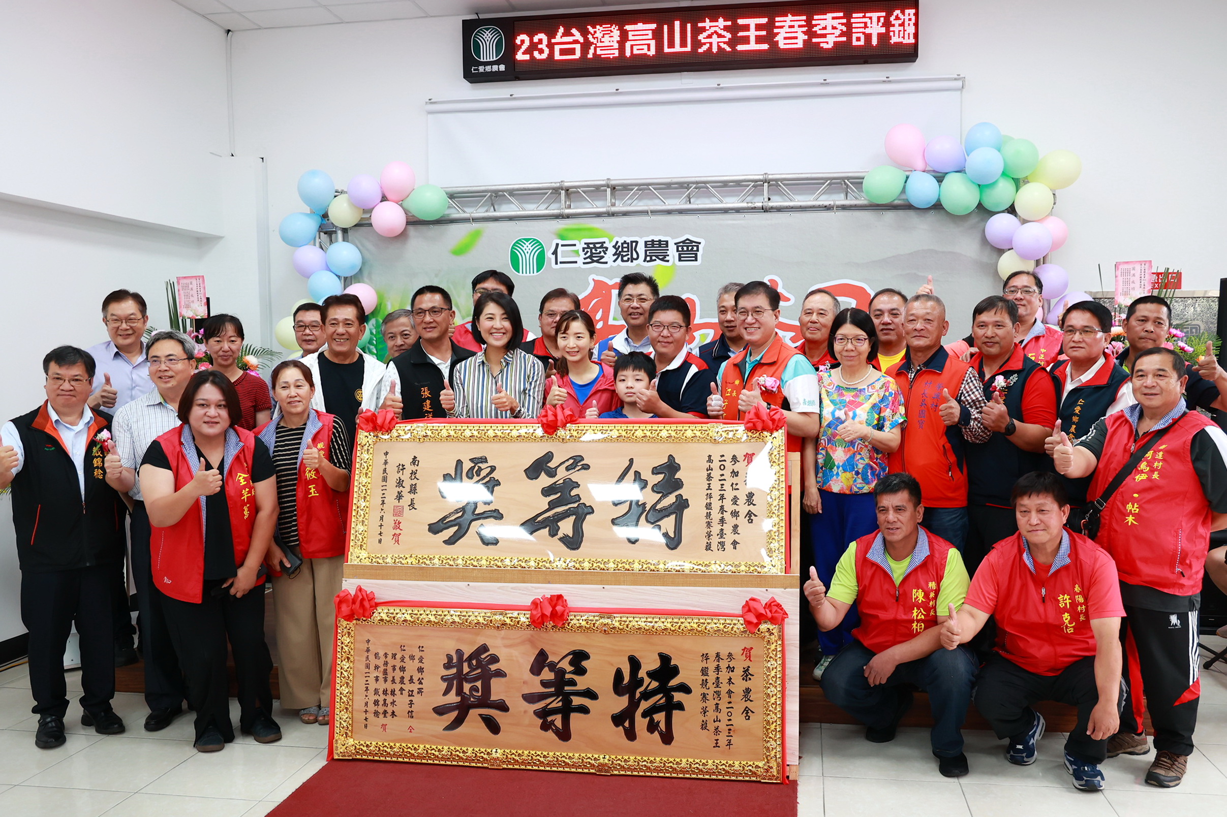 仁愛鄉農會17日上午於南豐村五岳巴萊館4樓舉辦台灣高山茶王春季評鑑競賽頒奬活動,縣長許淑華受邀為獲獎的茶農頒獎鼓勵,許縣長肯定農會的用心和推廣,堅持嚴格的評鑑方式,為仁愛鄉高山茶打出口碑,直接帶動茶葉的銷售。