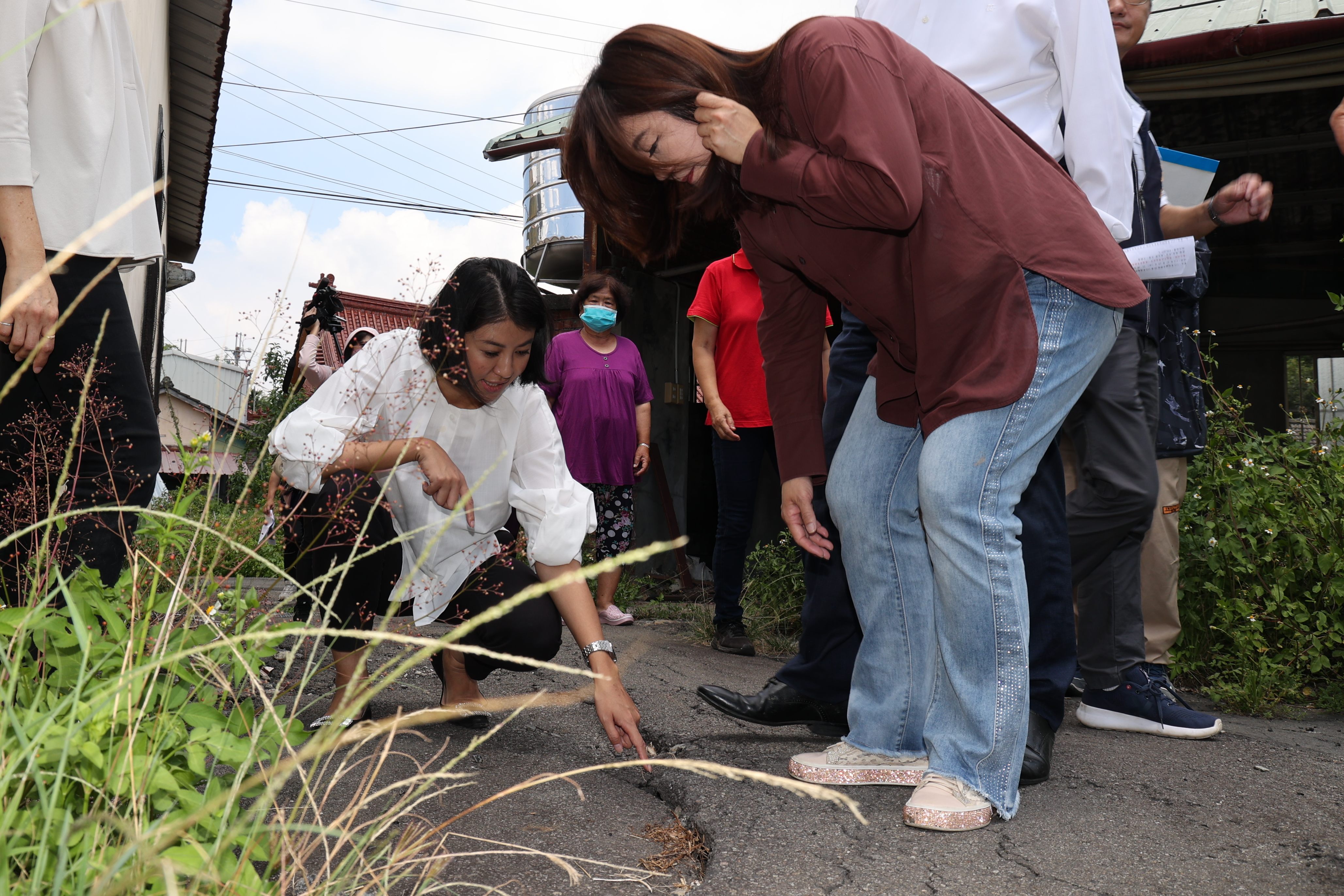 最後,許縣長來到坪頂里南坪路29號前道路、巷曲,及股坑巷46號前道路,許縣長實地踏勘了這處聚落巷弄嚴重龜裂、塌陷受損的路面,更在當地12鄰88歲張永順老鄰長的指引下,看到令居民憂心忡忡,已經破損不堪重踩的水溝蓋,許縣長注意到老當益壯剛從農園返家的張老鄰長打著赤腳,馬上說,這麼危險的水溝蓋,如果像老鄰長穿著「皮鞋」誤踩一定會受傷,實在應該立即改善。許縣長隨即簽核了兩處逾200萬元的路面及排水溝蓋改善工程。