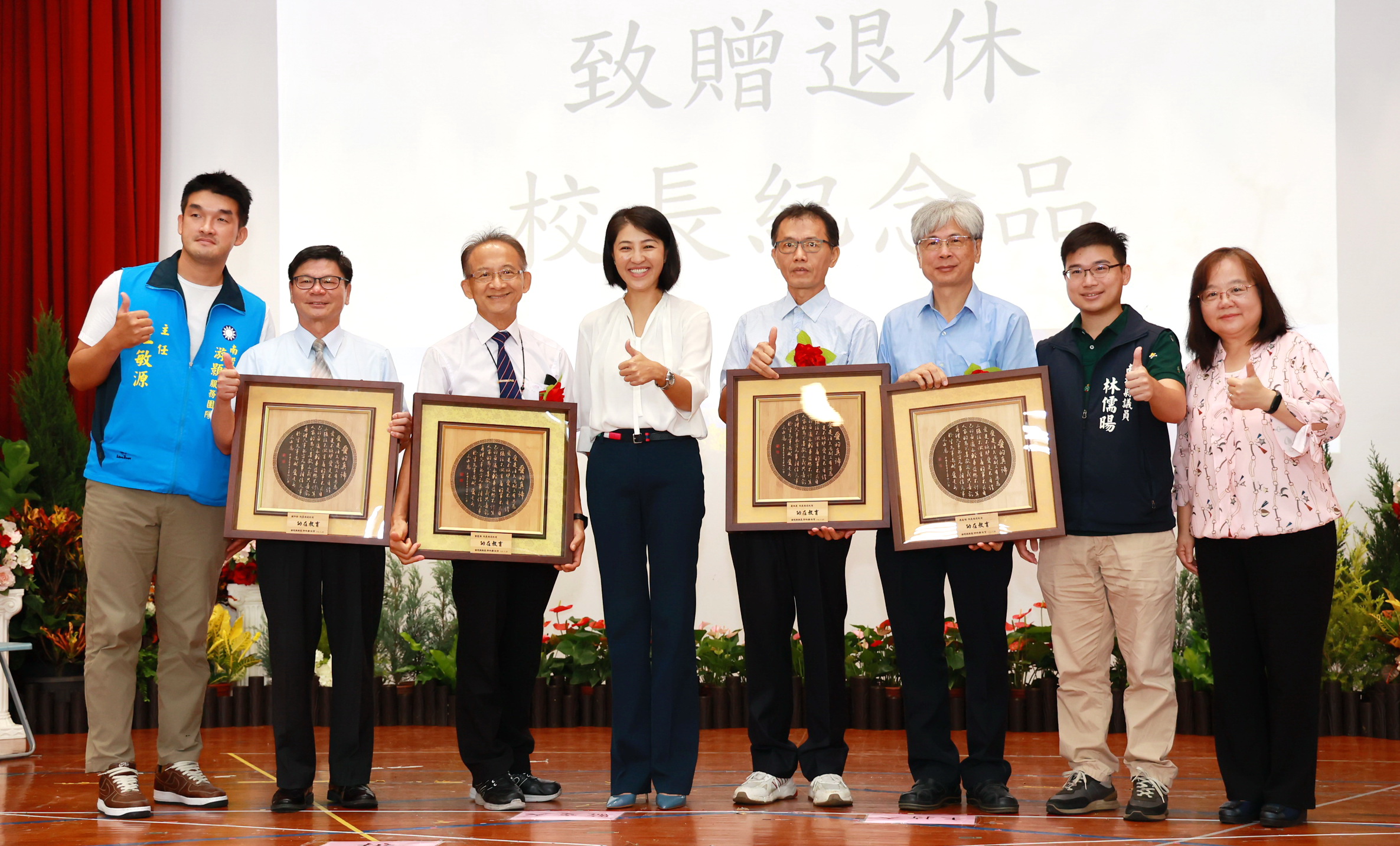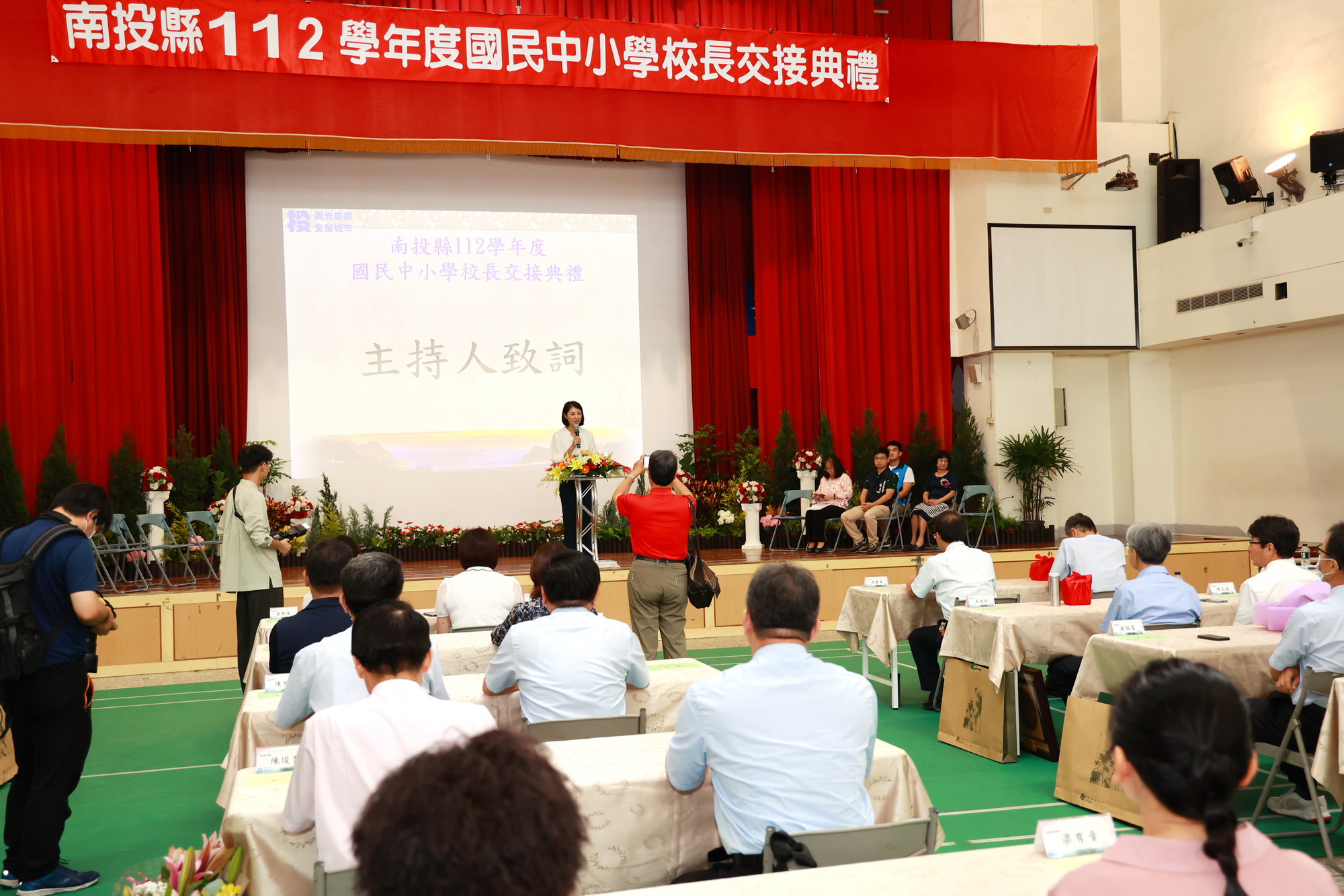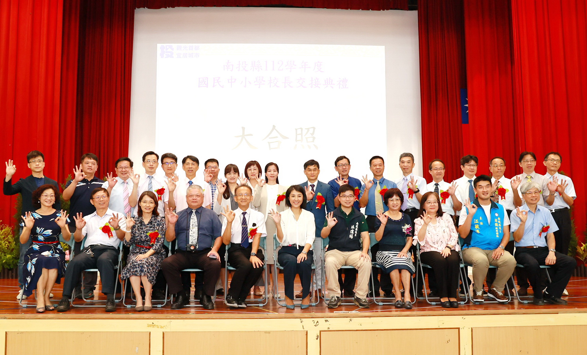 南投縣112學年度第1學期中小學校長交接典禮,21日在南投市平和國小舉行,35位新、調任校長,由縣長許淑華主持佈達,並在縣府主計處長陳美秀監交下,宣誓交接就任,許縣長也頒贈5位退休校長紀念品,肯定並感謝榮退校長們對教育的貢獻。