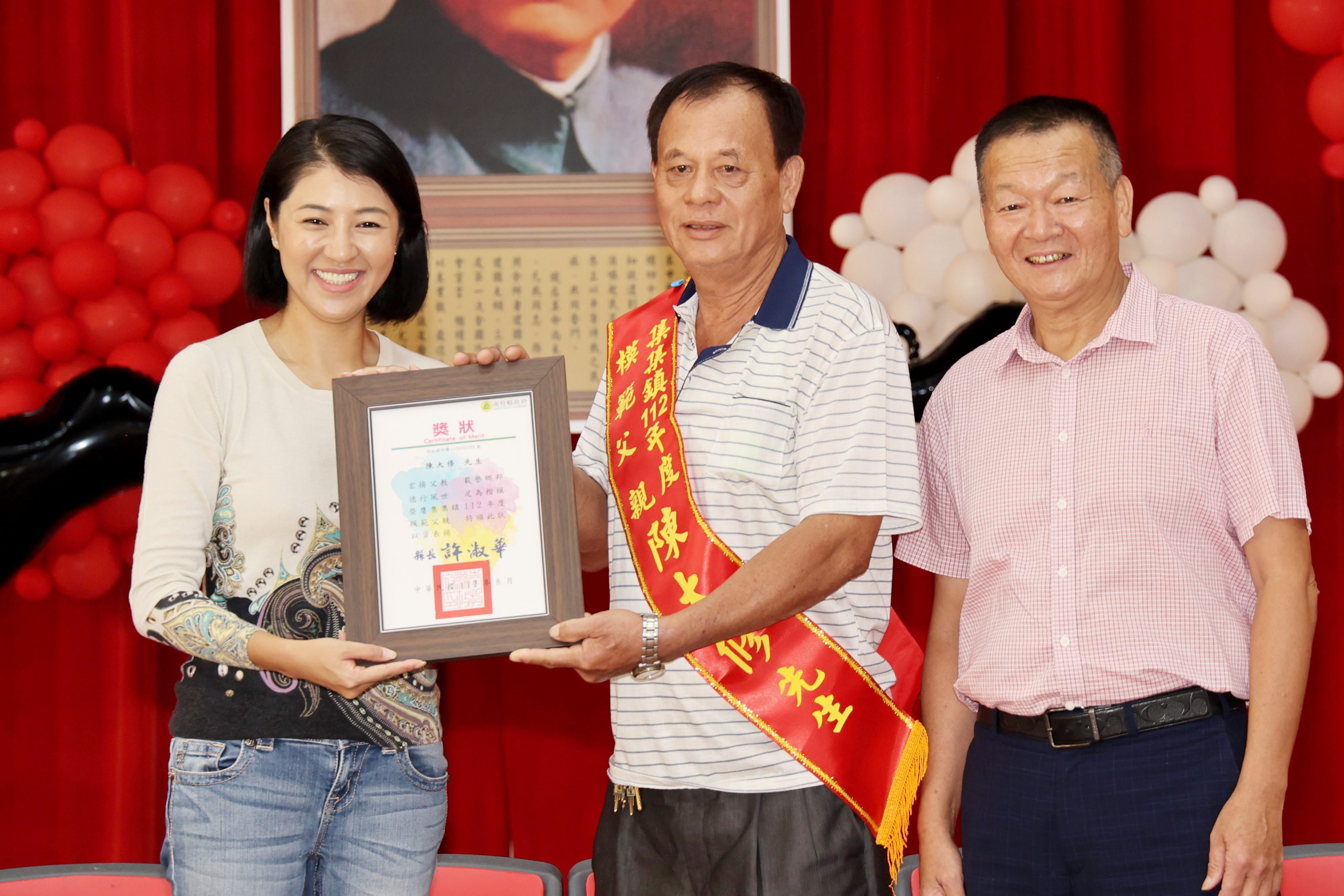 許縣長也頒發紅龍果評鑑第一名的名間鄉青農張祺翔,及綠竹筍評鑑冠軍集集鎮青農黃文典。
