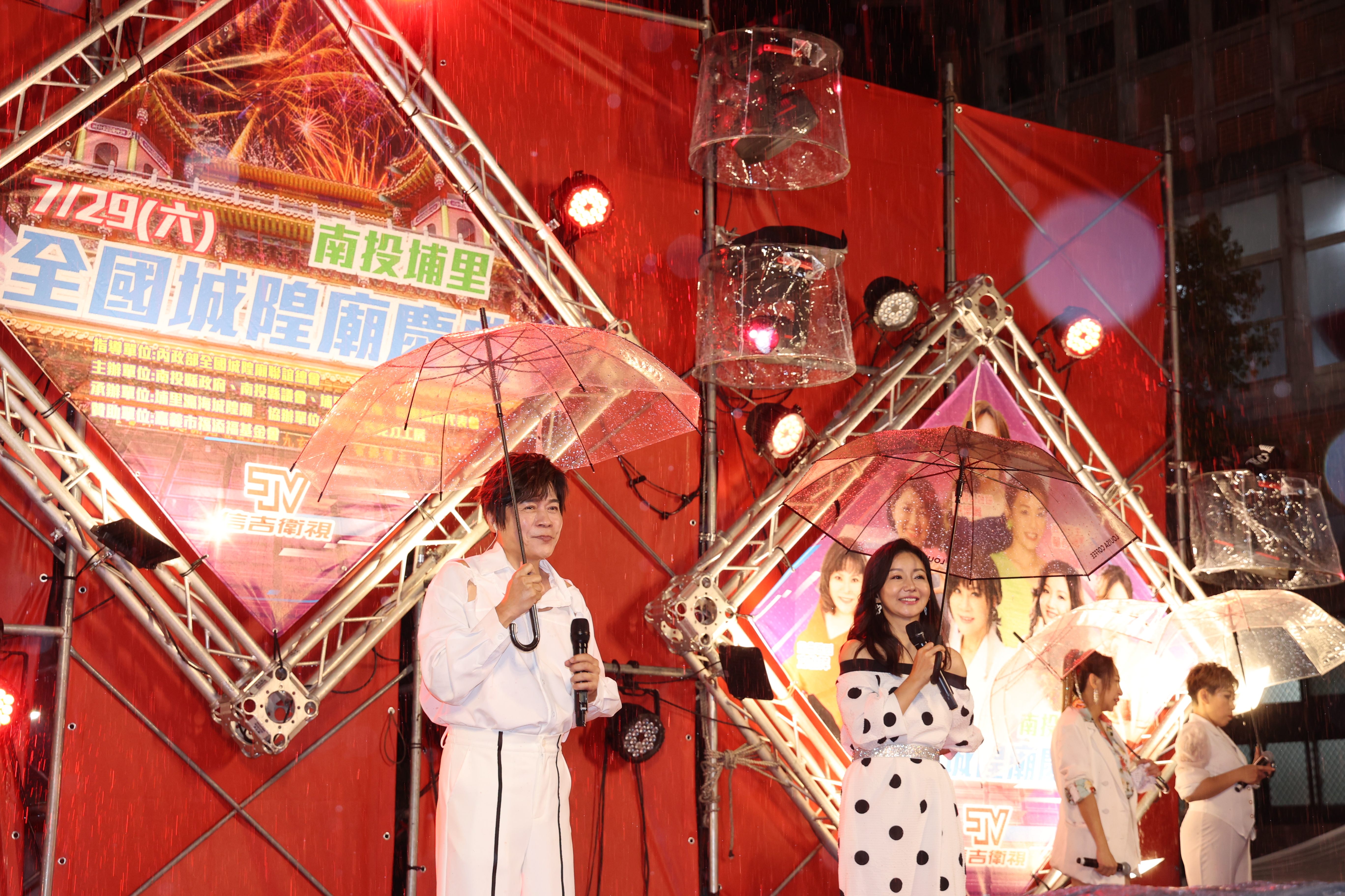 29日晚的大型賀壽晚會,邀請到綜藝天王康康、藍薰(COS黃小琥)擔任主持,重量級卡司有金曲歌后秀蘭馬雅、張秀卿、龍千玉、方怡萍,以及金曲歌王洪榮宏、蔡小虎等10多位藝人輪番上台獻唱,台上台下不畏大雨滂沱,熱絡互動齊心為城隍爺賀壽,強強滾的場面十分感人。