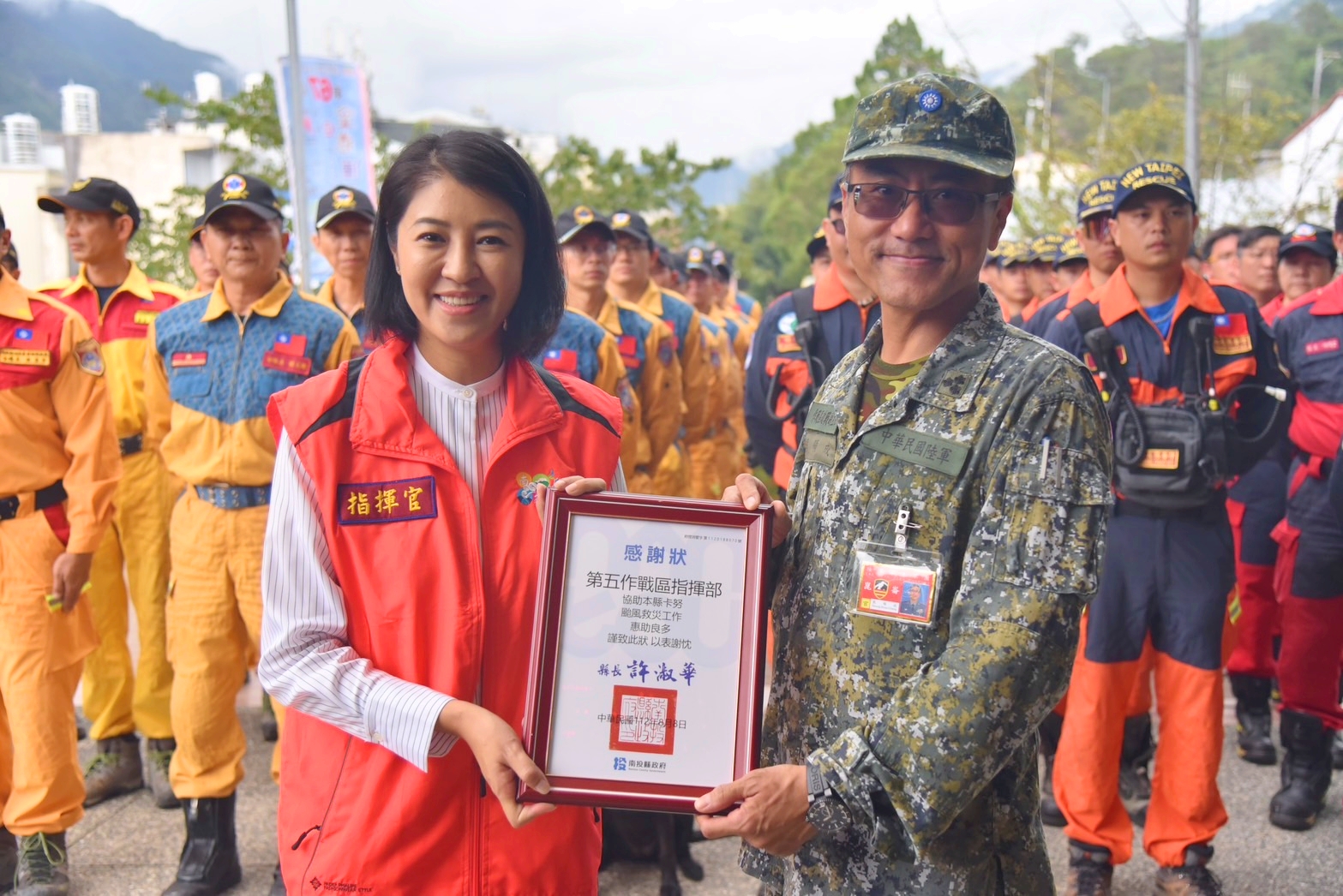 為感謝搜救人員辛勞,許淑華縣長8日下午到仁愛鄉公所頒發感謝狀,包括內政部消防署特種搜救隊、台中市政府消防局、新北市政府消防局特搜大隊、新北市政府義消特搜大隊、第五作戰區指揮部、南投後備指揮部等,約60人參加。