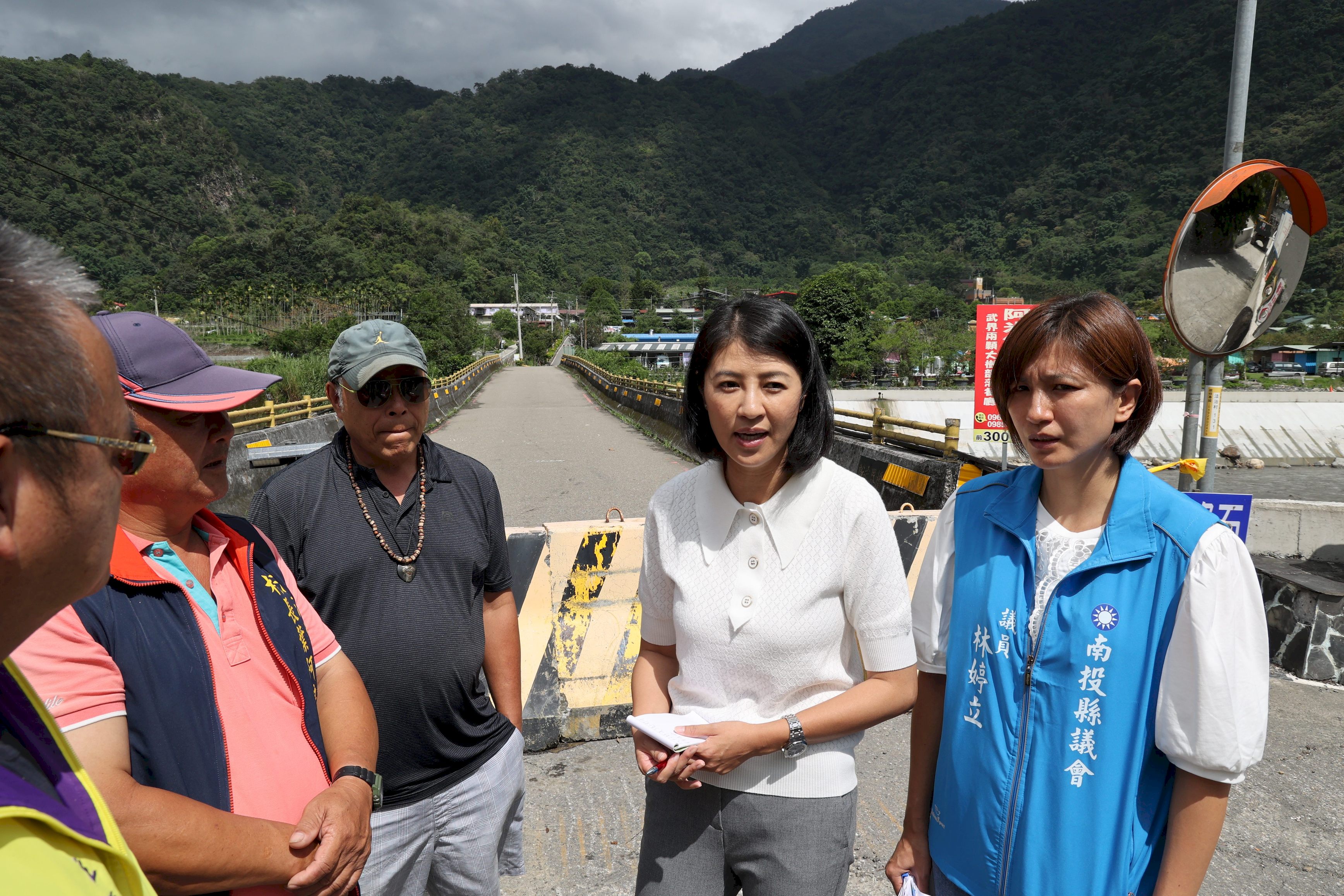 許縣長13日中午,在縣議員林婷立、仁愛鄉代表會主席洪文全及法治村長葉阿良、萬豐村長余明星、親愛村長潘筱玉、中正村長石金水及眾多地方民眾陪同下,先抵達橋面下陷變形封閉的投71線重要橋梁新武界橋,葉村長反映說,這次風災所幸村民家園並未直接受災,但是除了新武界橋亟須徹底檢修,還有濁水溪堤防基礎淘空、簡易自來水受損猶待復建等等問題,許縣長除允諾全力爭取中央復建經費,也提醒務必加速申報農災損失爭取現金救助來應急。