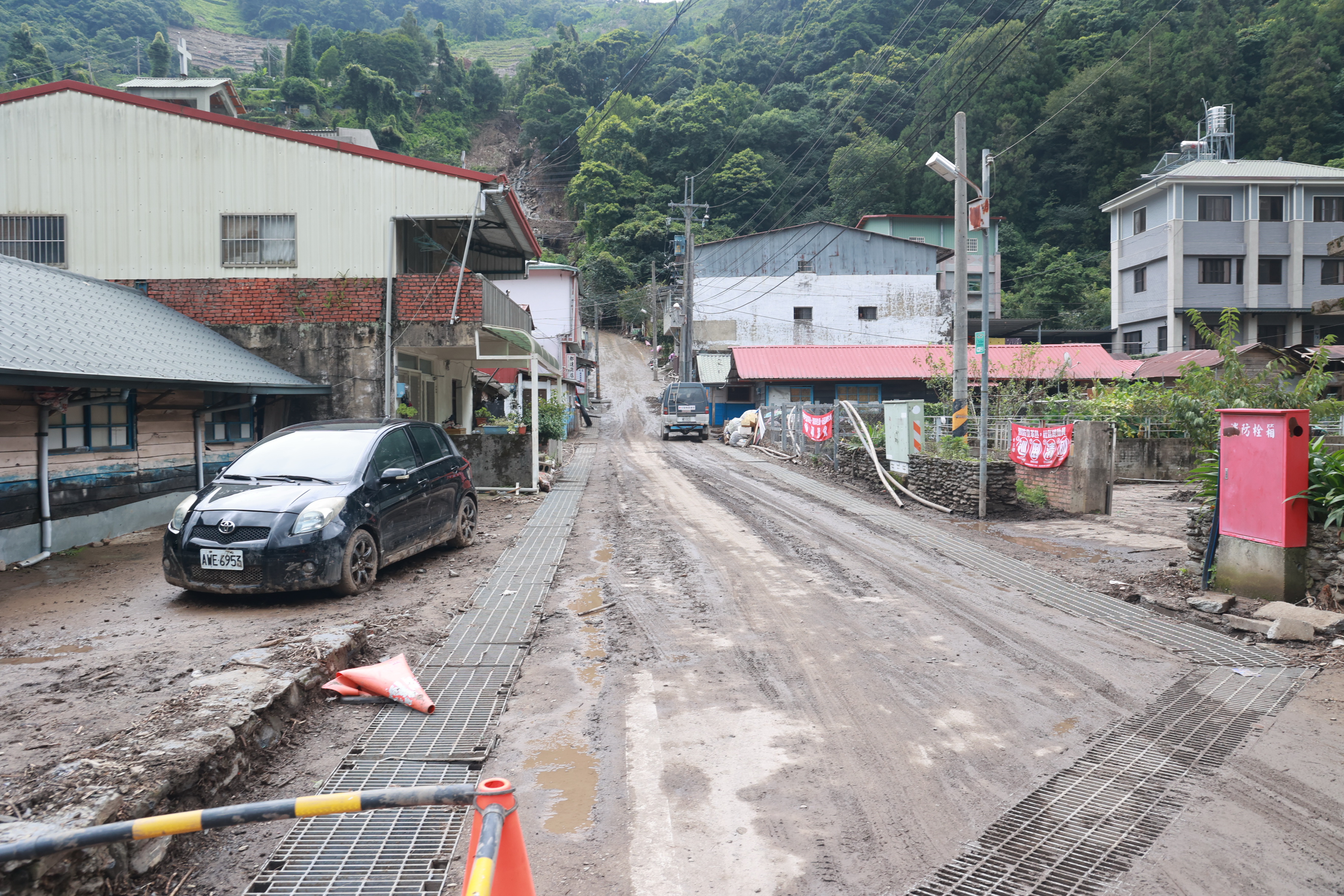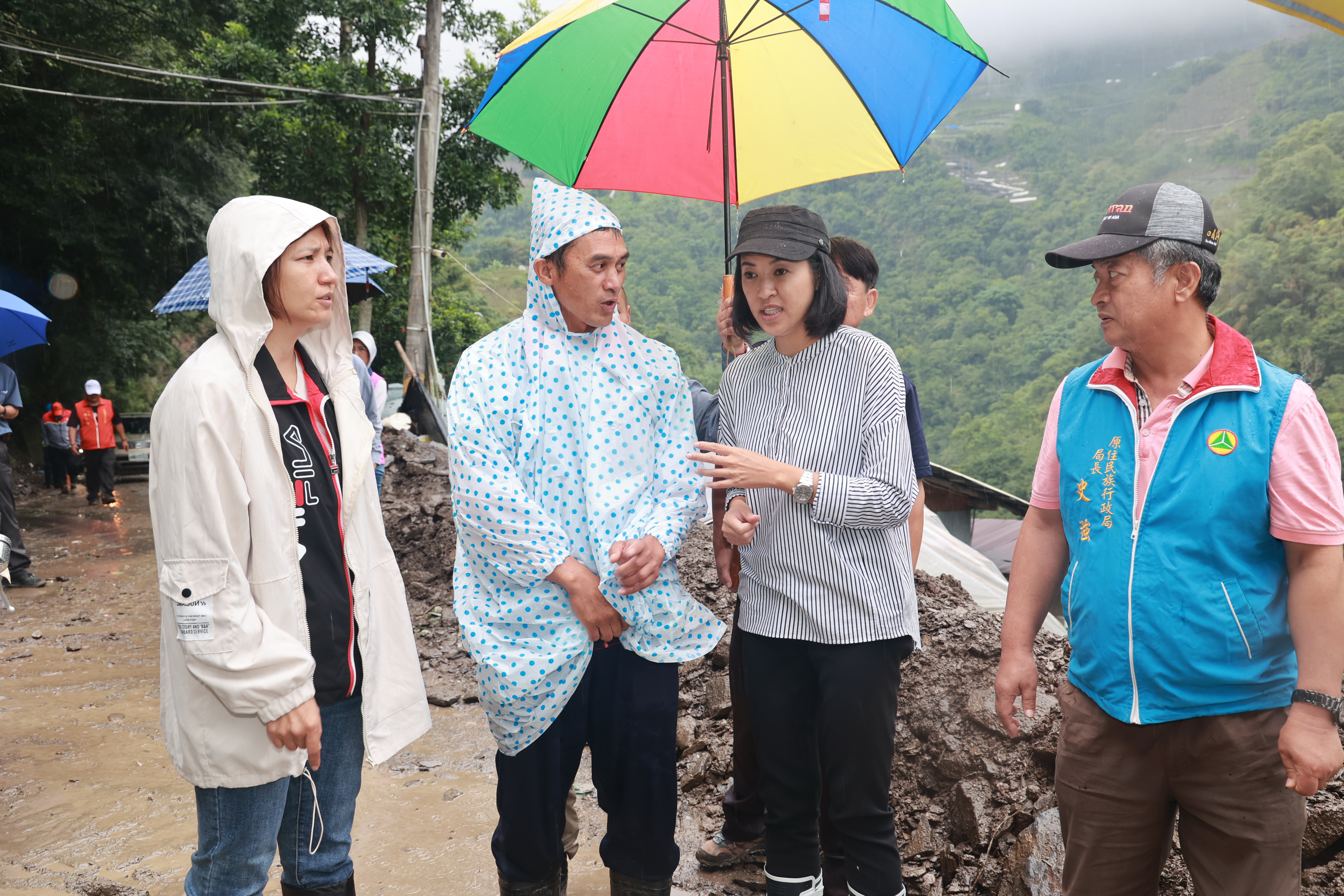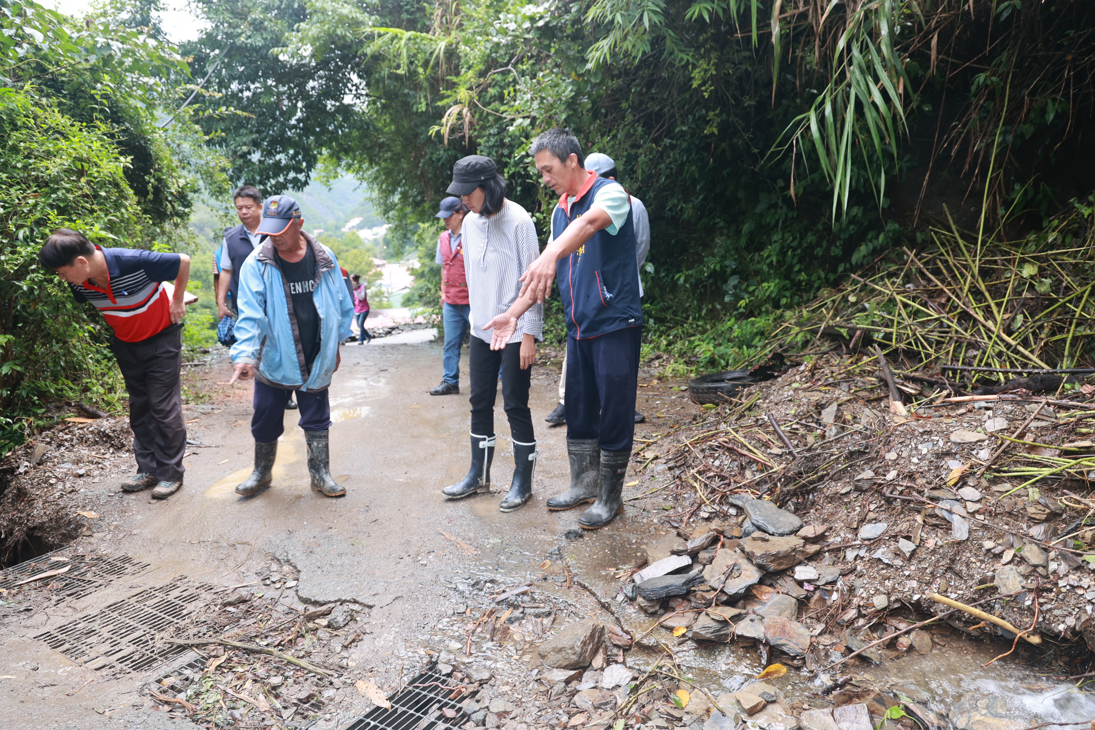 隨後,許縣長一行來到都達村的平靜部落了解受災情形,並至民宅中關心受災戶的生活狀況與需求,因該部落主要災害來自投85線6K+100處位於部落上方的大坍方,泥水土石順著大排水溝溢流而下,造成部落中主要巷道兩排民宅嚴重淹水,地方反映當務之急除了改善該處坍方外,就是部落內大排水溝也要加大加深,才能承載大水沖刷,對此許縣長表示認同,會盡快提報災修工程予以改善。