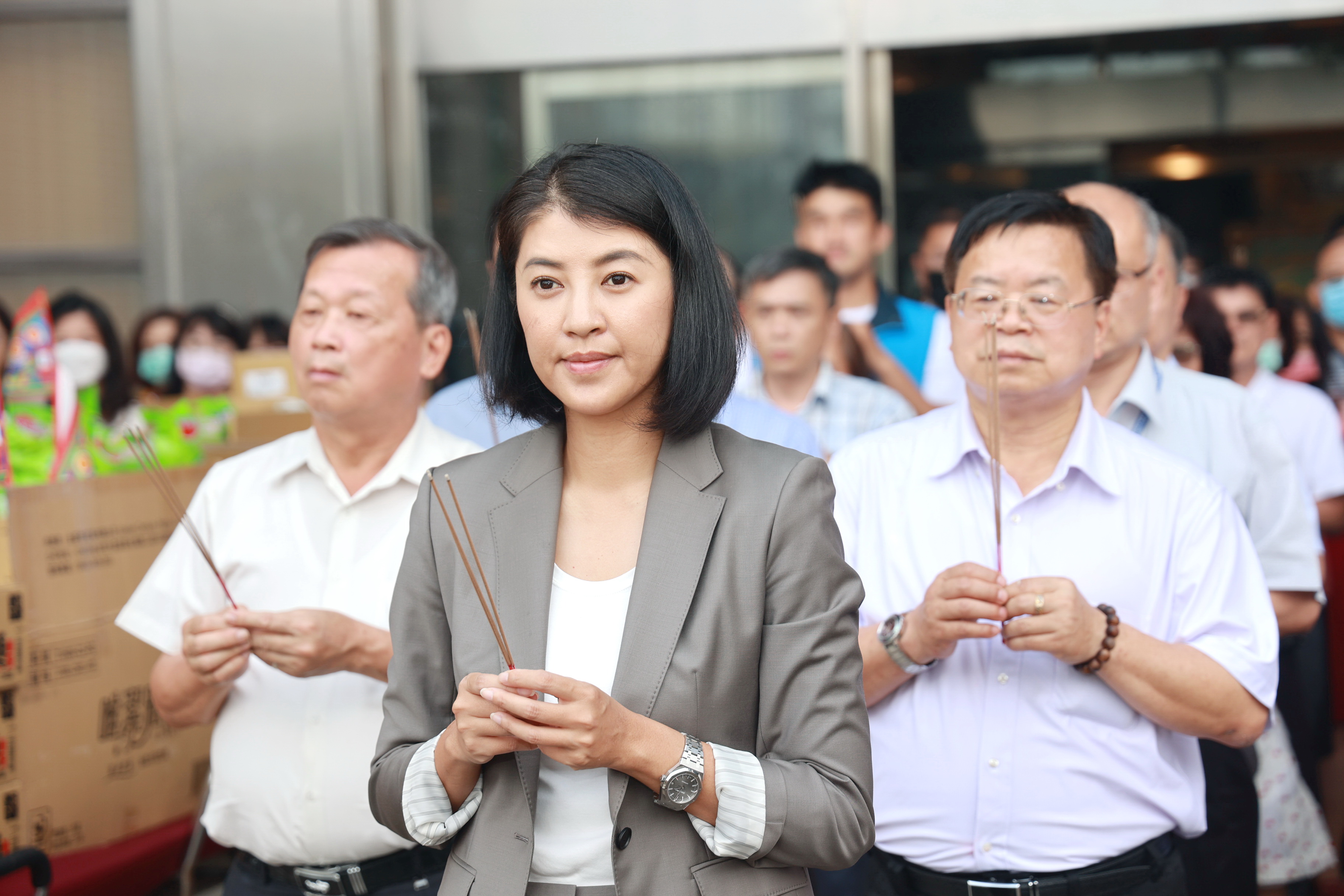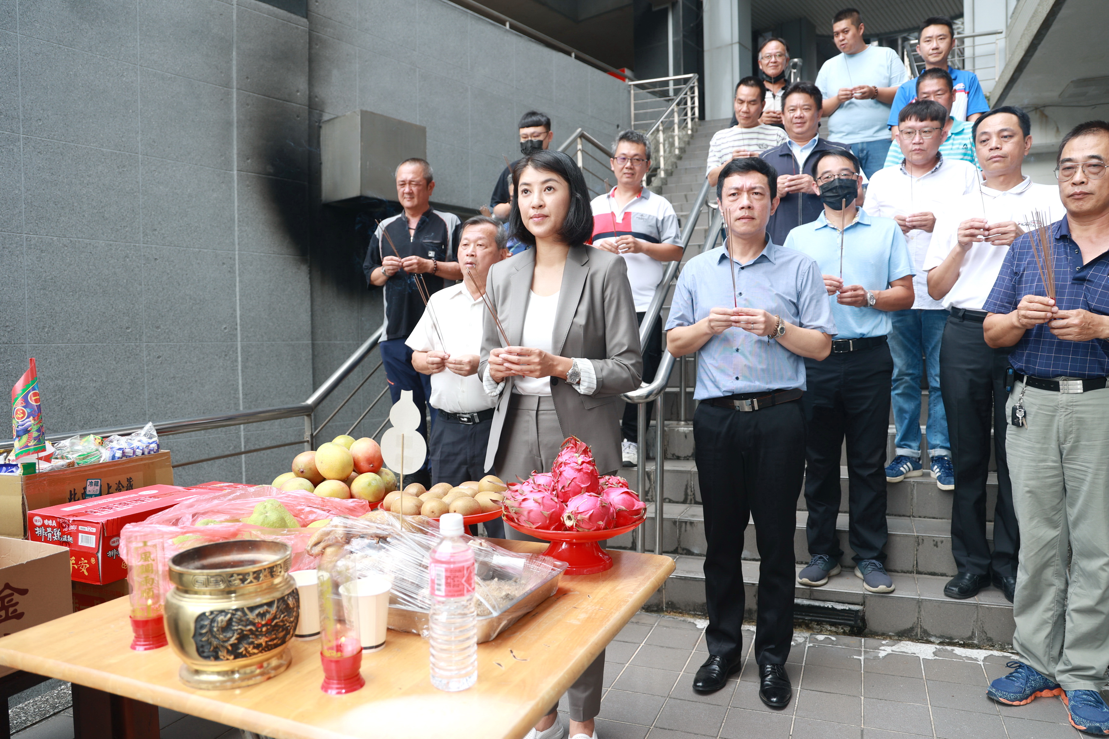 縣府司機常因機要公事四處奔波,縣府也在司機室外準備香燭供品,由許縣長及王副縣長、新聞及行政處長蔡明志率領司機員工一同虔誠上香禮拜,祈願諸事平安、行車順利。