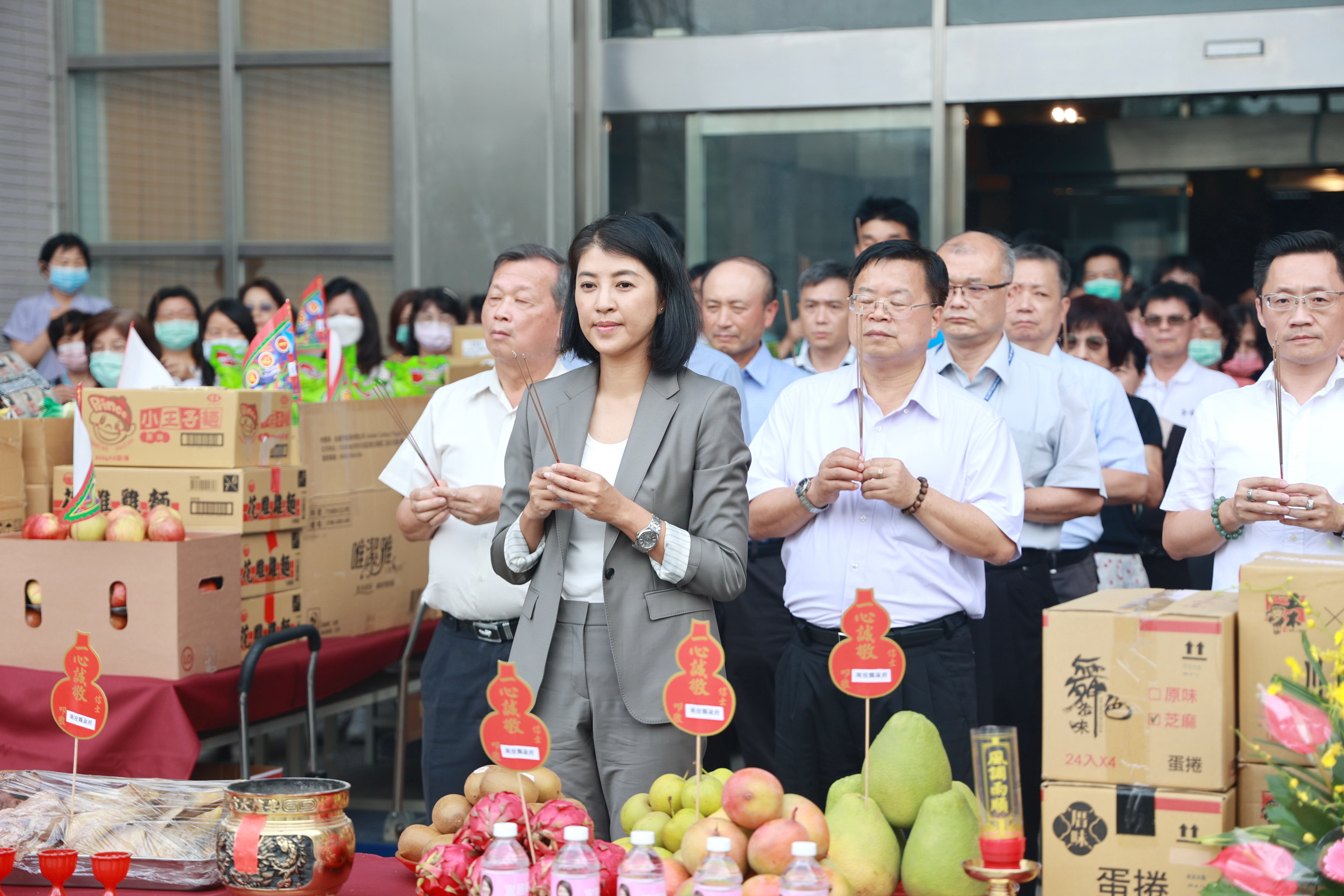一年一度的中元節將屆,為祈求縣政順利、闔境平安,縣府29日在縣府大門口前舉行中元普渡祭拜儀式,縣長許淑華率同副縣長王瑞德、縣府參議、秘書及一級主管、員工等,以鮮花敬果、清酌香燭祭拜好兄弟,祈求風調雨順、縣境平安,四時無災,縣民健康幸福。