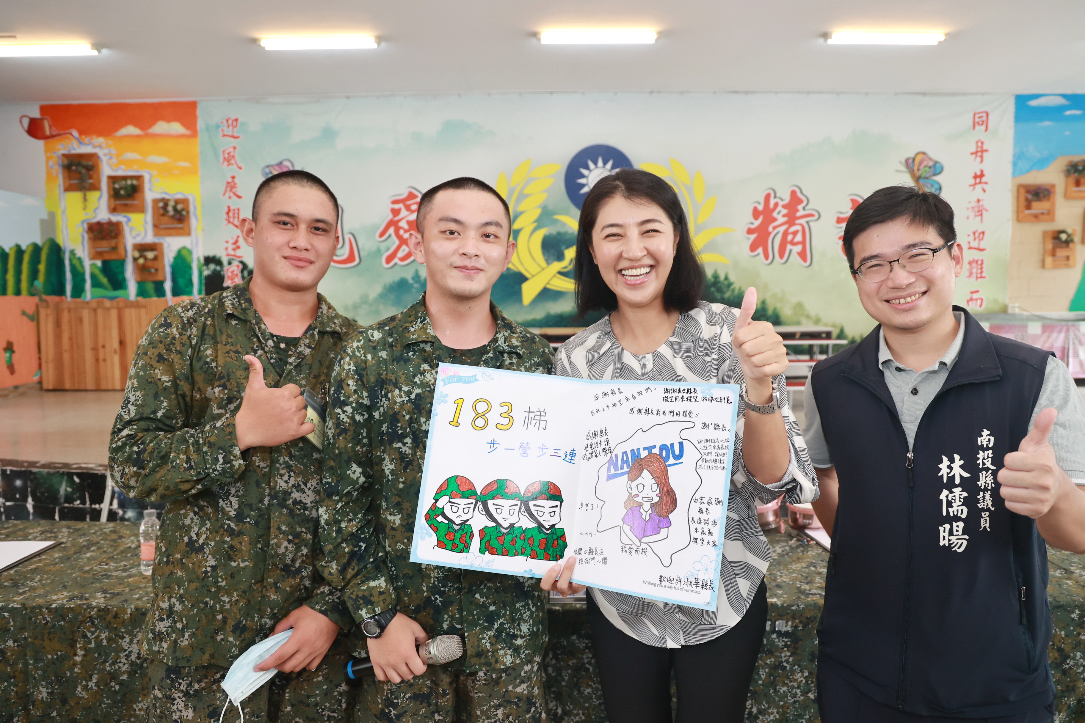 當天,縣議員林儒暘、游顥、南投縣軍人服務站羅專員、縣府民政處長林琦瑜等人都到場關心。許縣長也關心本梯國姓鄉一位役男,日前家庭突逢變故後,目前在營適應情形,並懇託熊上校多予照撫關懷,縣府已函請國防部同意准予提前退役,返鄉照顧年邁祖母,熊上校允諾盡力協助。