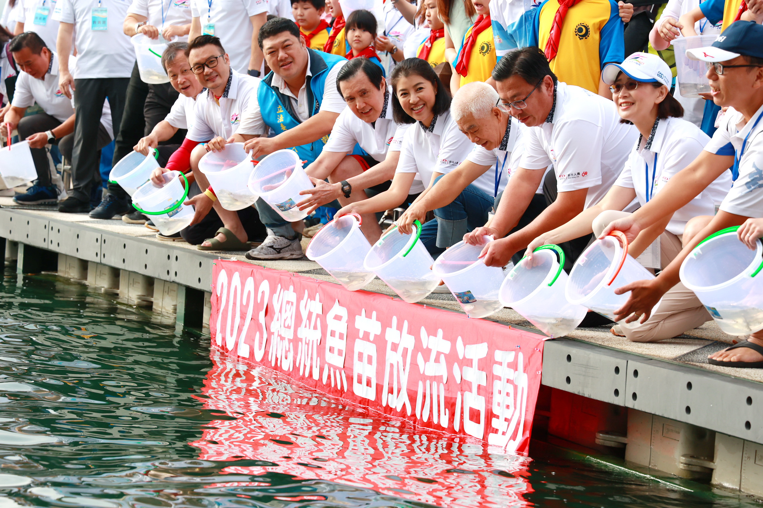 日月潭國際萬人泳渡嘉年華於上午7點,由195名身障泳士率先出發下水揭開序幕,隨後許縣長、副縣長王瑞德、前總統馬英九、教育部體育署賴麗幸委員、日月潭國家風景區管理處簡慶發處長、縣議員簡千翔、游顥、林芳伃、魚池鄉長劉啟帆、埔里四季早泳會會長陳忠戊及新光人壽總經理黃敏義等貴賓,在明潭國小學生服務下,於水社碼頭放養 1 萬條總統魚(曲腰魚)魚苗。