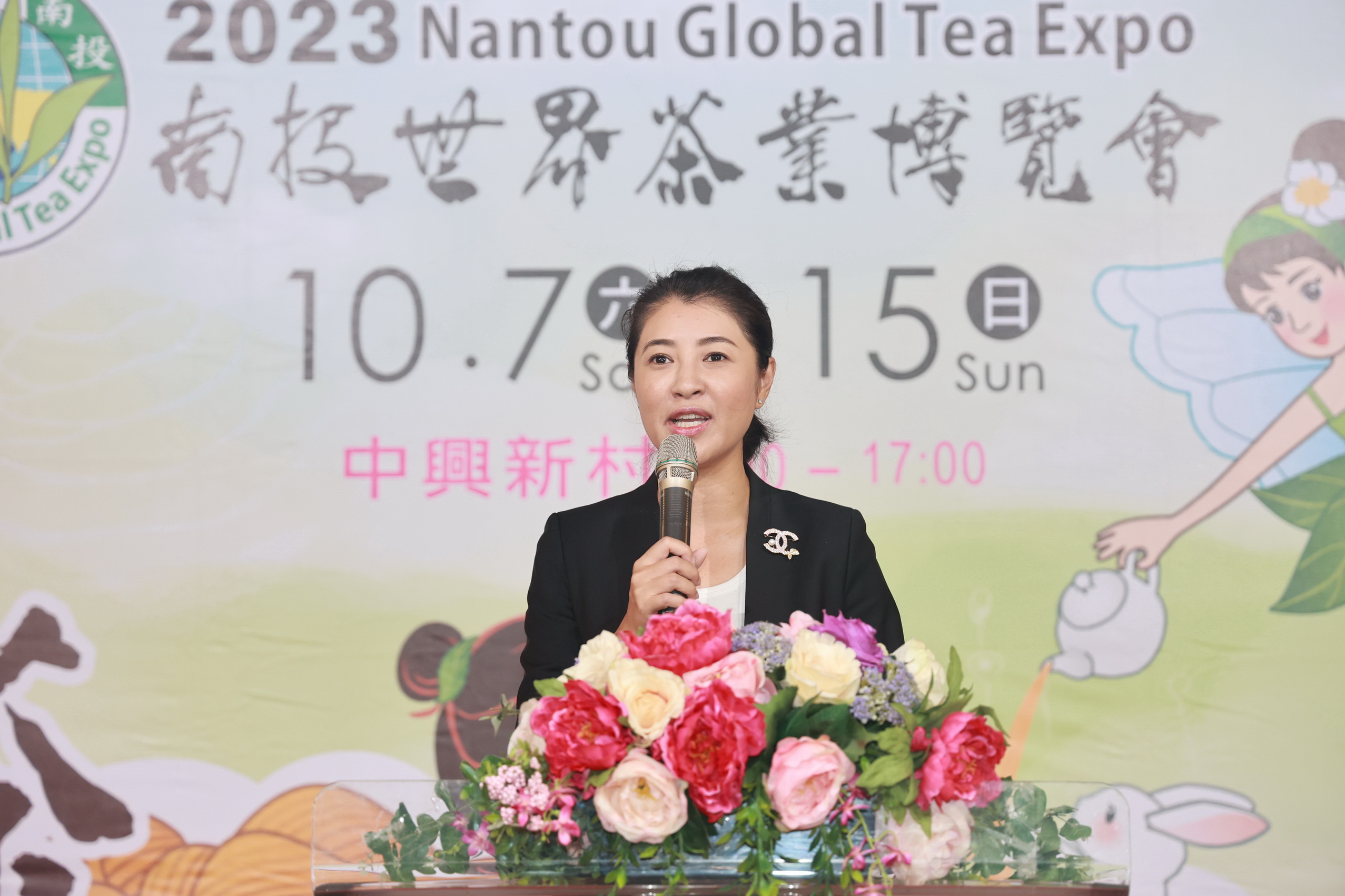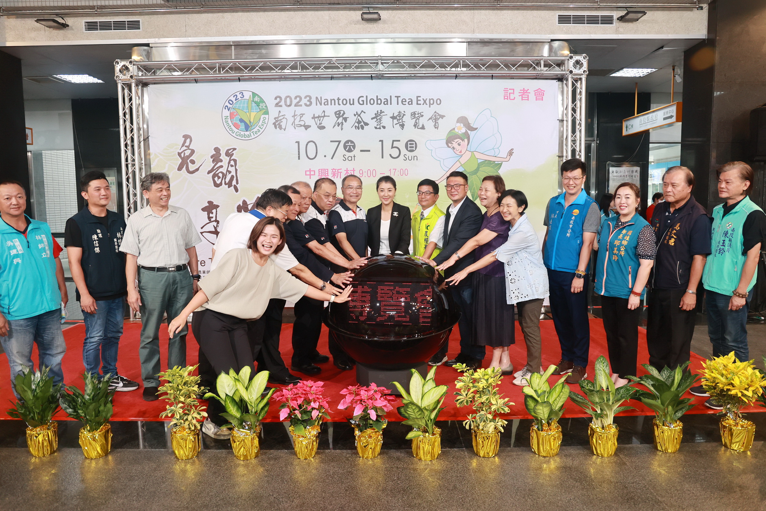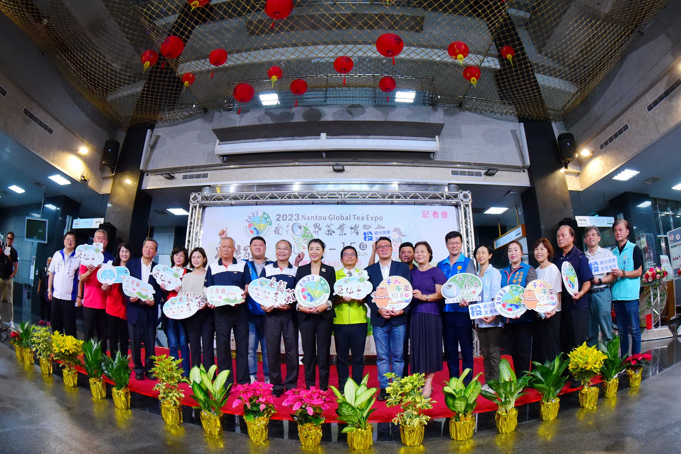 縣長許淑華26日上午在縣府一樓大廳主持2023「南投世界茶業博覽會」記者會,與副縣長王瑞德、農業部農糧署副署長蘇茂祥、縣議員陳淑惠、宋懷琳、游顥、簡千翔、林友友、南投市長張嘉哲、國姓鄉長邱美玲、仁愛鄉代表會主席洪文全、縣農會總幹事曾明瑞、鹿谷鄉農會理事長陳文益及13鄉鎮市農會總幹事一同宣佈第13屆南投世界茶業博覽會10月7日正式啟動。