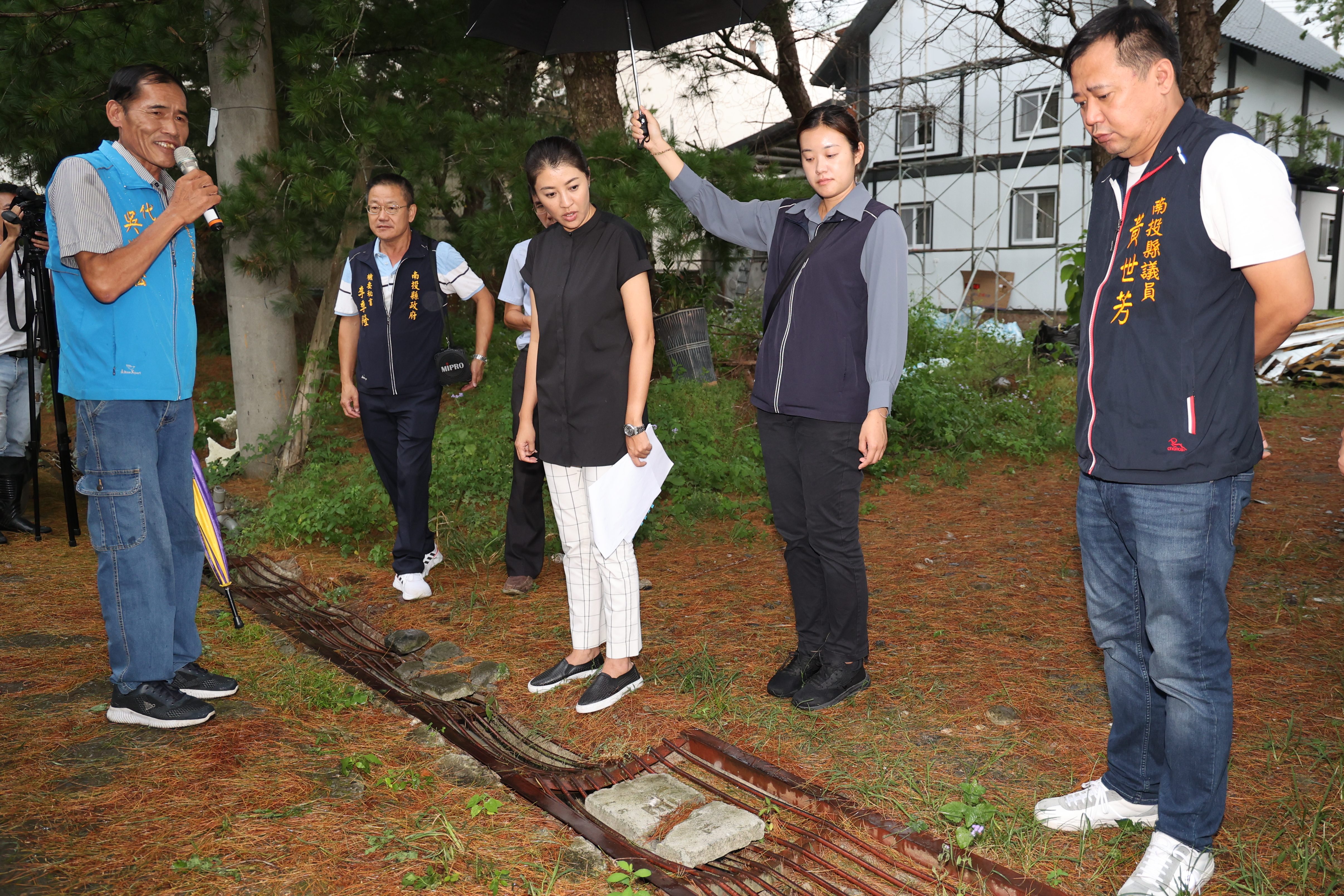 許縣長6日的埔里會勘行程,縣議員吳國昌、黃世芳、陳宜君、蘇昱誠,立委馬文君主任潘杰宏及鎮代王銘彥、吳淇淞、桃米里長曾秀桃、同聲里長周文棋、枇杷里長陳炫魁、北安里長葉俊宏、北梅里長潘棋榮、大湳里長阮聰智、大湳社區理事長潘亭開都陪同,還有許多埔里鄉親到場共同關心。