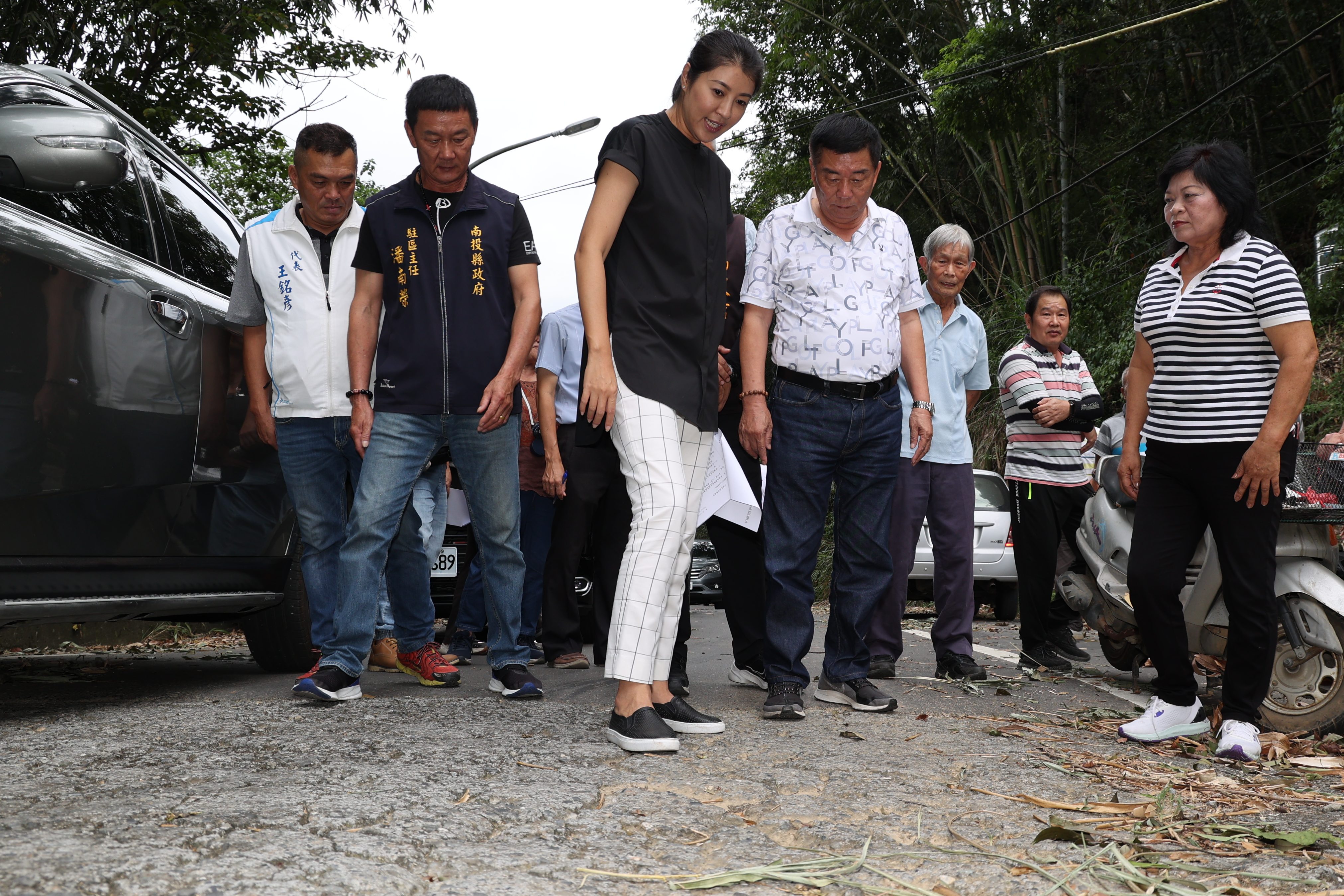 許縣長一行首先來到路面已嚴重龜裂破損的埔里鎮桃米里種瓜路農路支線,許縣長當場簽核107萬元經費,將由工務處刨除重鋪長達170公尺的路面徹底將路況更新改善,桃米里民也把握機會爭取全線拓寬起自桃米經成功里到國姓鄉北山村接147線道的投68線,許縣長很重視鄉親的心聲,當場要求工務處做成紀錄優先呈報爭取中央補助。接著許縣長會勘了同聲里南興街及新生路的多段年久失修的巷弄路面,也二話不說簽核了近90萬元經費,允諾儘速刨除重鋪新路面。