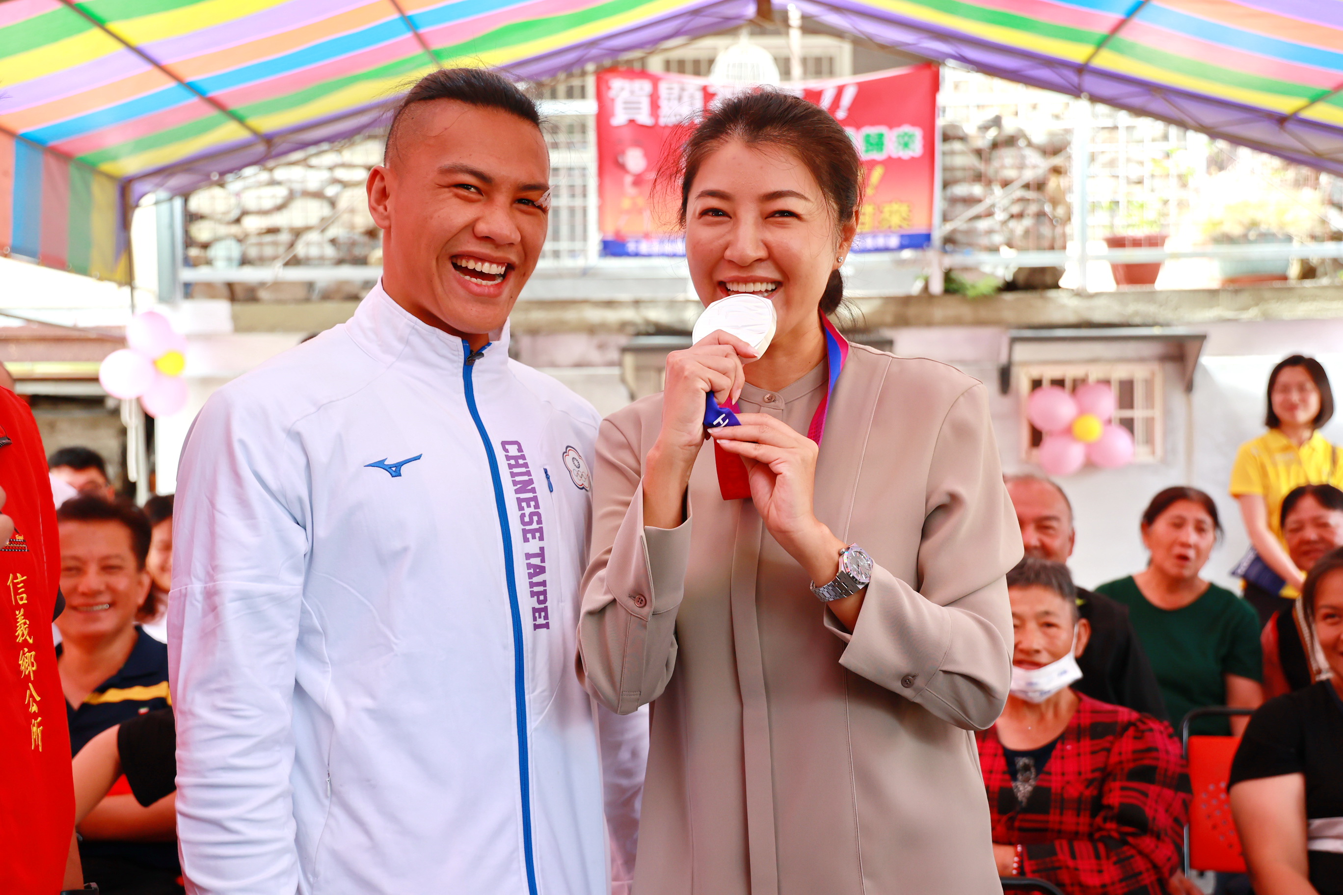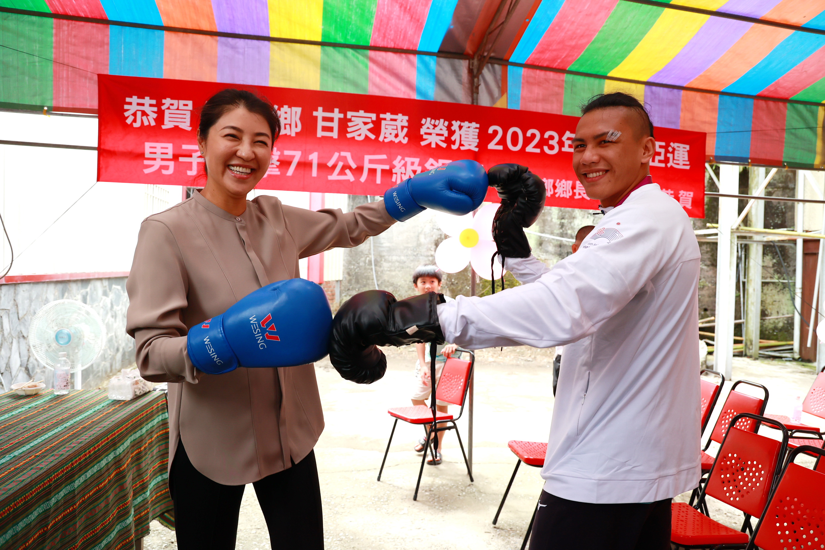 許縣長是在縣府教育處長王淑玲的陪同下,前往信義鄉望美村祝賀甘家葳榮獲杭州亞運男子拳擊71公斤級項目銀牌成績,他同時也是台灣睽違53年來獲得亞運男子拳擊賽的第一面獎牌,難能可貴。包括縣議員全文才、鄉長全志堅、鄉代表會主席李國源及多位代表,還有村長及親朋好友皆到場關心同樂,原民族語歡呼不斷。