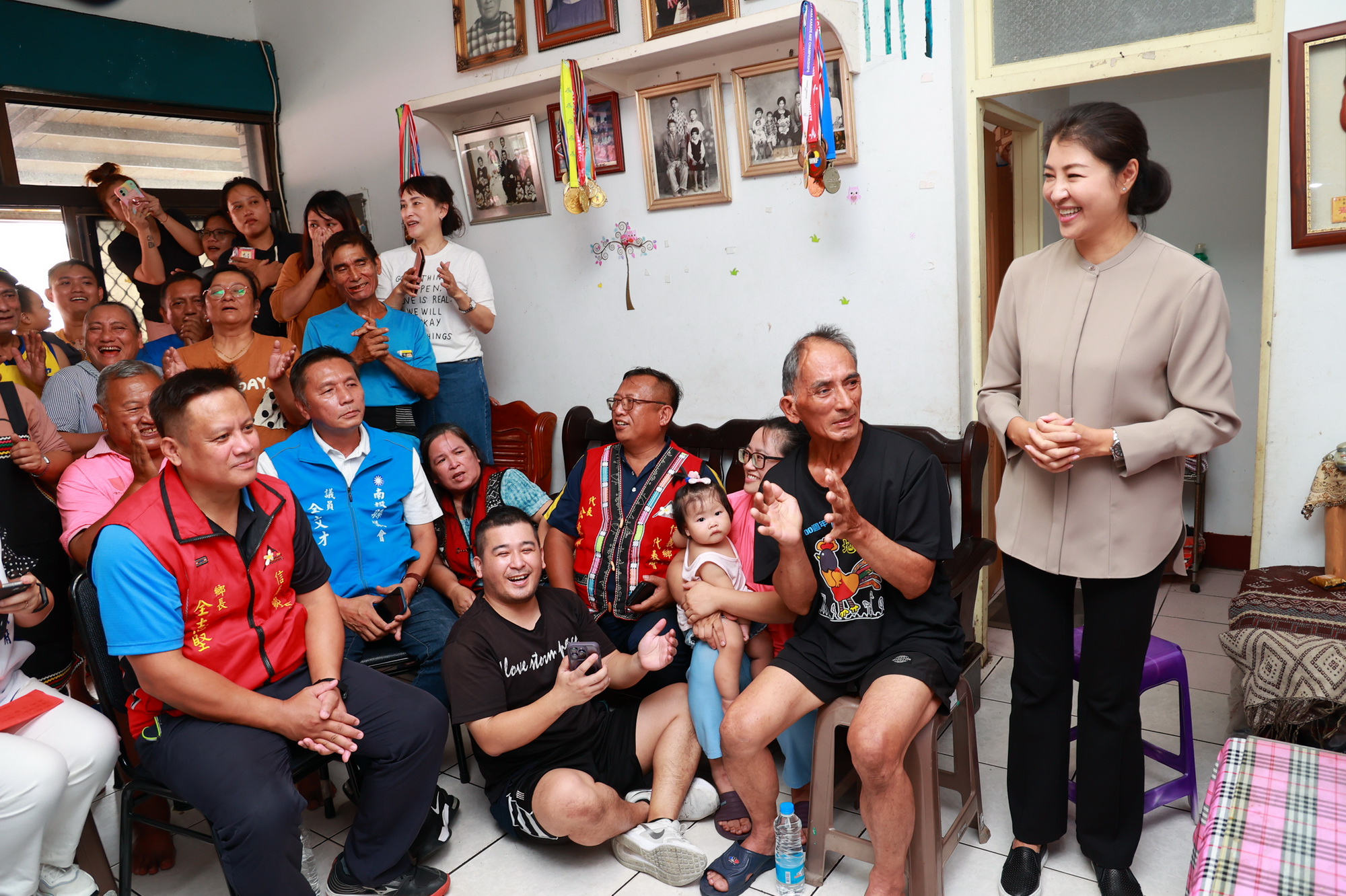 8日上午11:30同樣來自信義鄉的空手道選手谷筱霜剛好正在力拚亞運金牌戰,許縣長也特別轉往地利村,與谷爸爸及親戚朋友們齊聚一堂,一起觀看電視轉播為谷筱霜加油,並吟唱布農族的凱旋之歌慶祝谷筱霜榮獲亞運金牌,滿堂歡樂祝賀聲不斷。