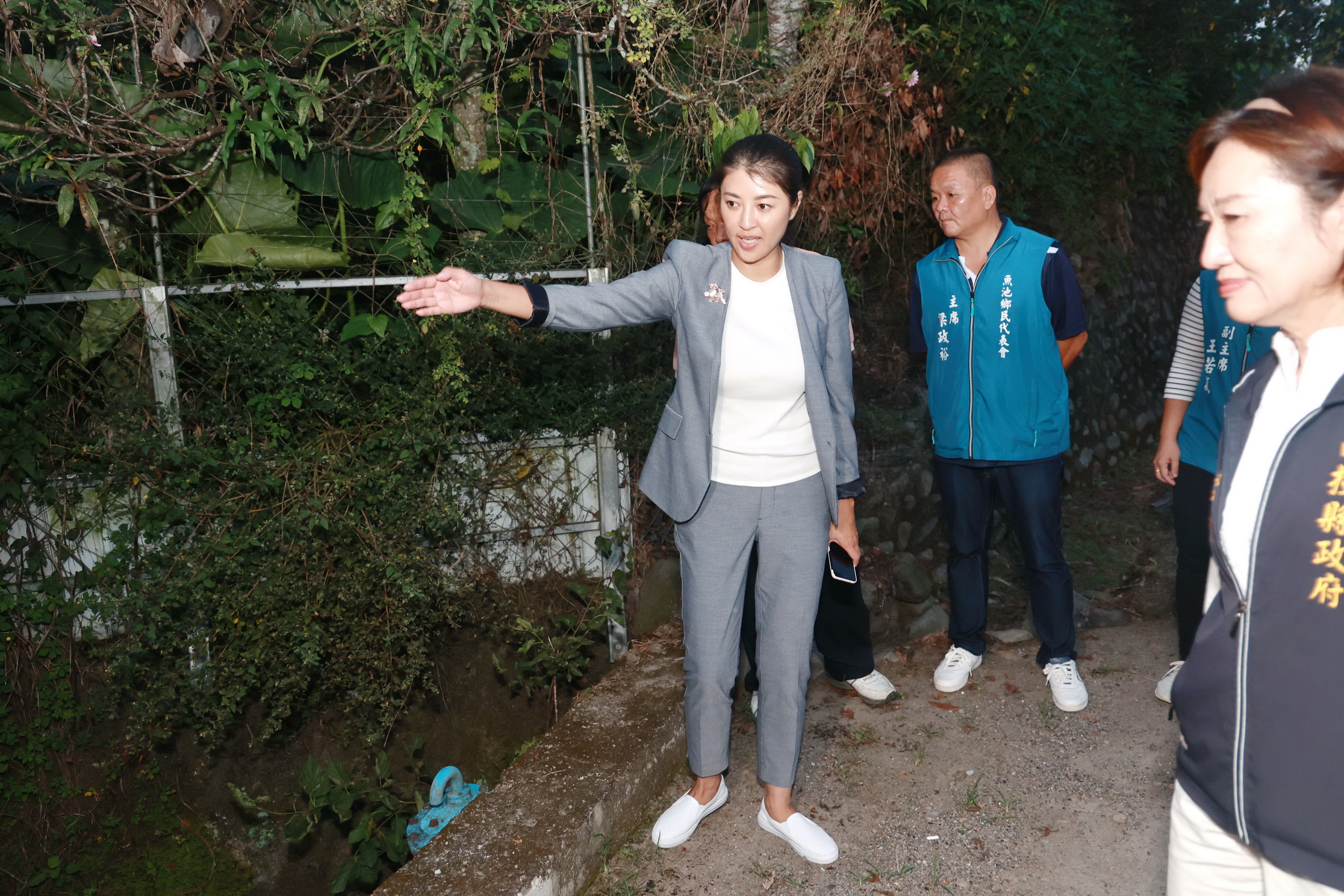 稍晚,許縣長也前往魚池鄉會同縣議員謝明謀、魚池鄉民代表會主席梁政裕、副主席王若嵐、立委馬文君服務處主任潘杰宏及多位代表、村長一同會勘武登村、大林村、共和村、新城村、大雁村等6村3處農路、3處排水溝、1處道路護坡及投69之1線路面及瓶頸路段改善工程,許縣長聽取工程簡報,並實地勘查,確有改善必要,總經費約需1,100萬元,縣長指示儘速發包改善。