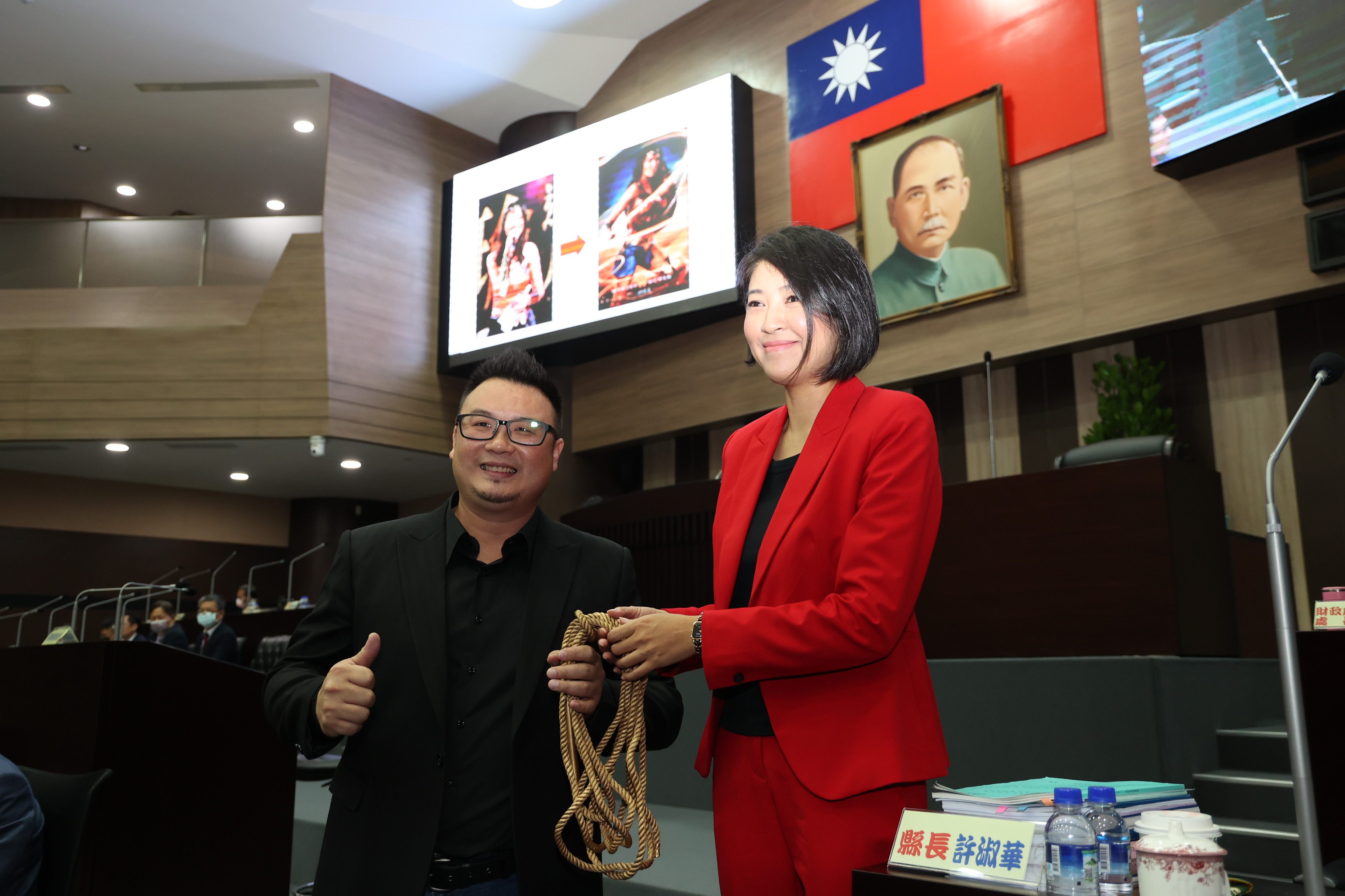 許縣長也虛心接受縣議員簡千翔贈送的神力女超人「真言套索金鞭」,簡議員期許許縣長藉此更積極要求、帶領縣府團隊戮力從公推動縣政;蔡宗智議員更直言要許縣長為上任後近半年的縣府團隊打分數;許縣長特別強調指出,感謝議員們的督促與對縣政的關心,她會優先自我鞭策,時刻要求自己推動縣政好還要更好,至於縣府團隊至今的表現,她認為初步已達到按照進度落實的目標,至於分數應該是留給議會議員們和縣民來打。