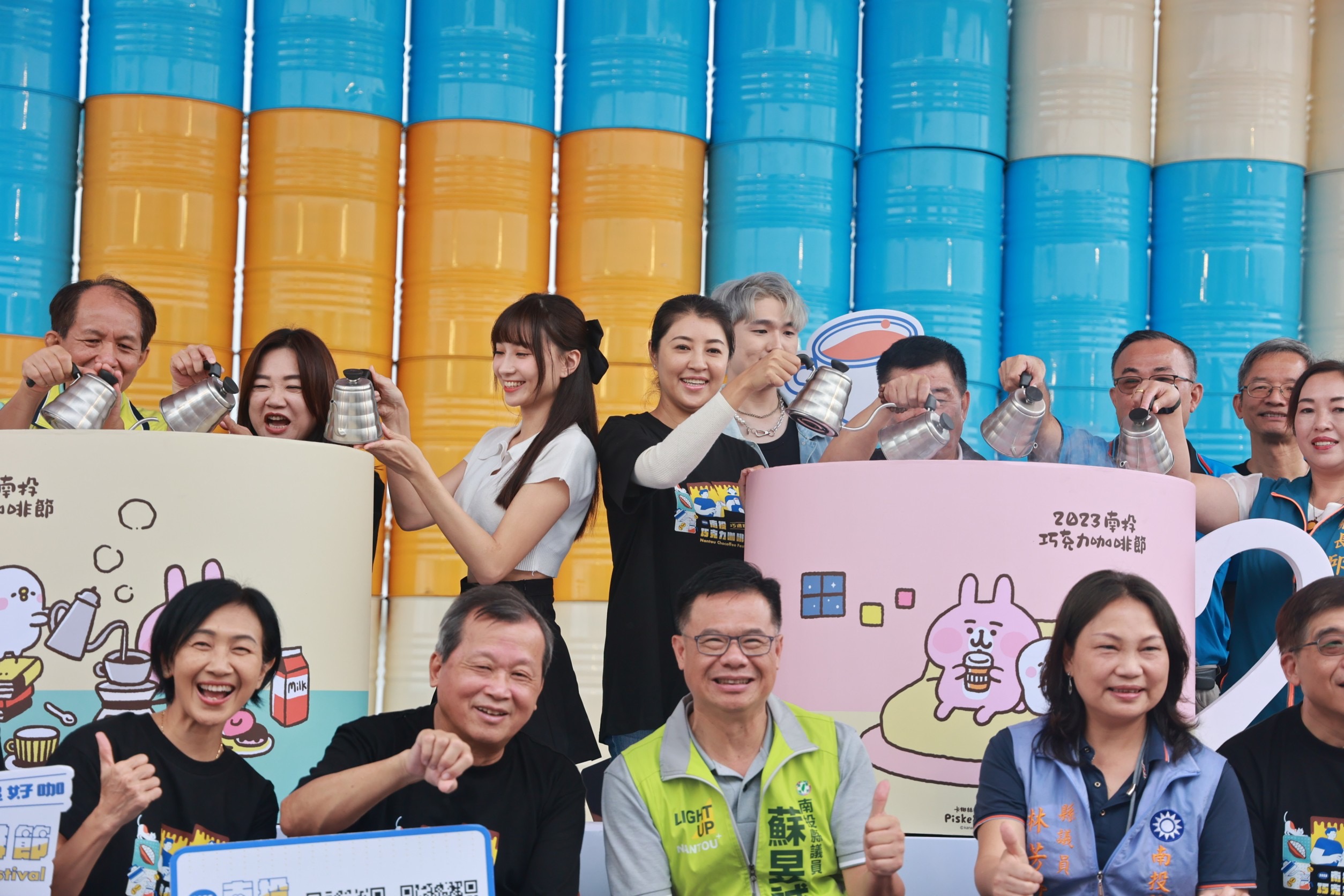2023南投巧克力咖啡節「巧遇好咖」活動28日在埔里福興溫泉區遊客中心旁盛大開幕,縣長許淑華帶領50家在地與台灣知名精品咖啡、巧克力及伴手禮業者熱情迎賓,會場咖啡香、巧克力濃醇,吸引數千民眾前來共襄盛舉,享受香醇浪漫的假期,場面熱鬧非常。 開幕儀式由許縣長帶領副縣長王瑞德、秘書長洪瑞智,攜手立委馬文君、縣議員吳國昌、林芳伃、陳宜君、蘇昱誠、石慶龍、林儒暘、副議長潘一全服務處主任黃明輝、埔里鎮長廖志城、魚池鄉長劉啟帆、國姓鄉長邱美玲、仁愛鄉長江子信、阿里山國家風景區管理處長洪維新、日月潭國家風景區管理處副處長廖錫標等嘉賓一同宣佈巧咖節正式展開,歡迎全國民眾自即日起至11月7日呼朋引伴一起來埔里喝咖啡、吃巧克力、泡溫泉、看花火,體驗手沖咖啡的樂趣,欣賞重磅歌手演出及卡娜赫拉的小動物無人機煙火秀等精彩多元的節目,品嚐在地美食。