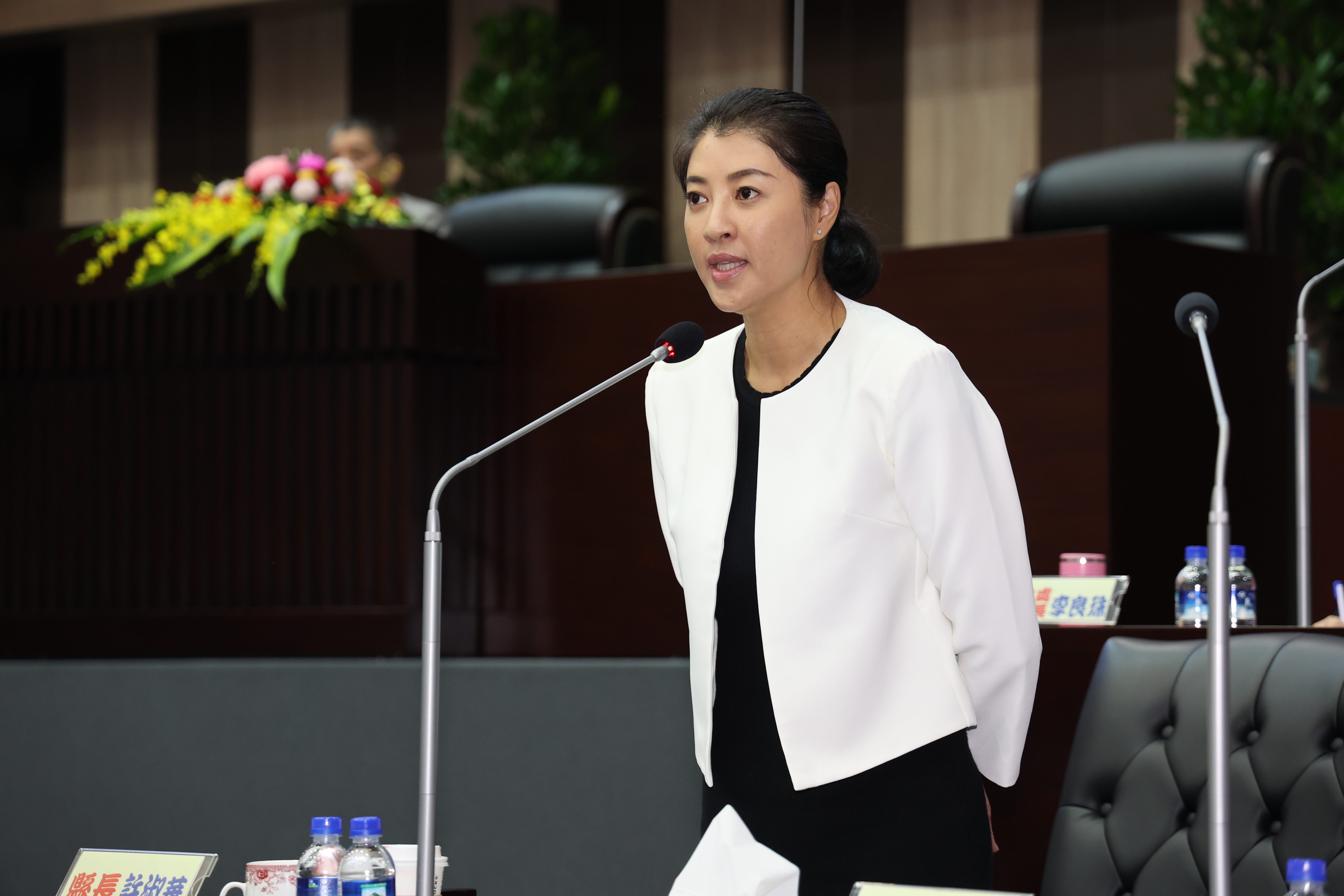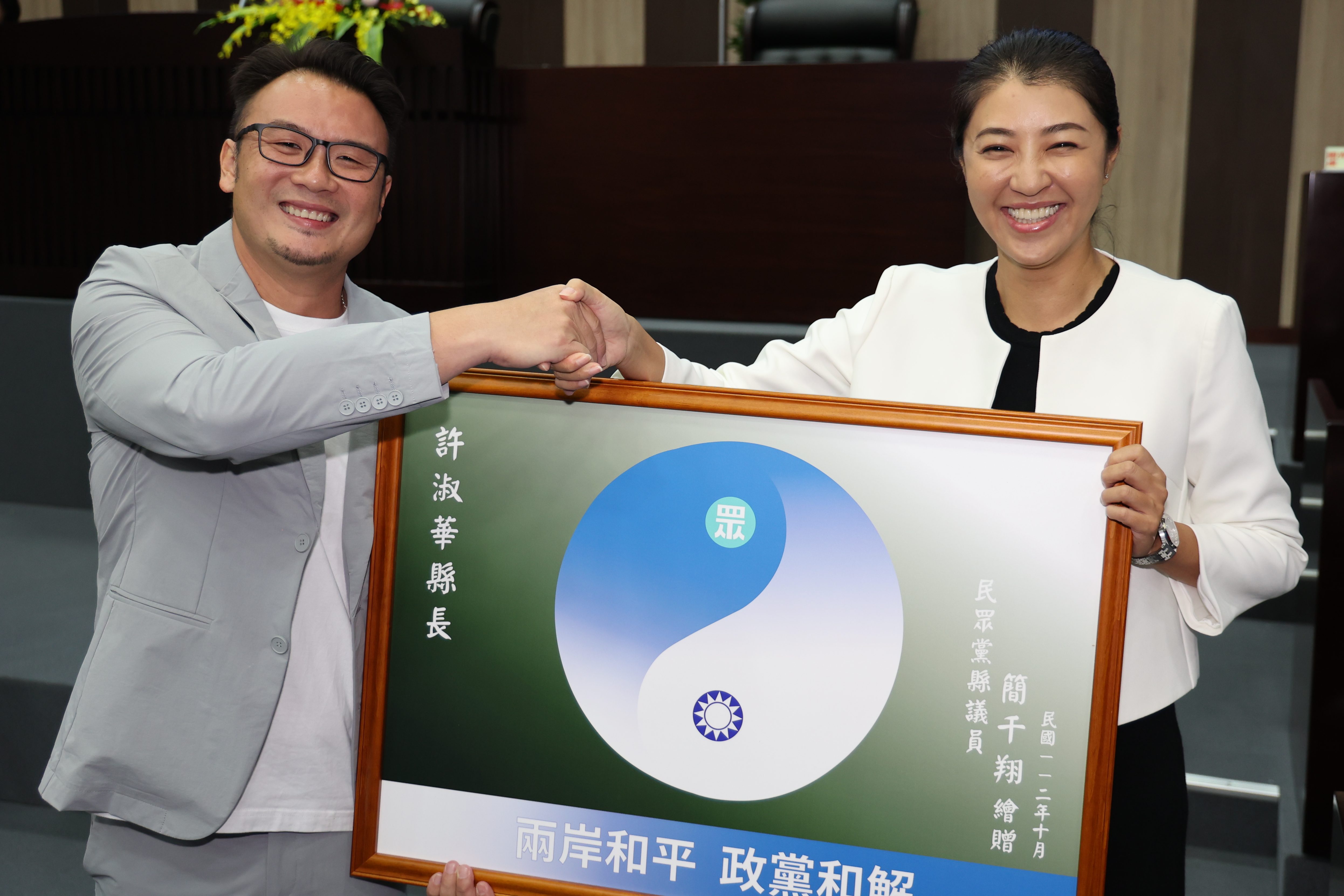 南投縣議會第20屆第2次定期會縣政總質詢,30日輪由簡賜勝、洪明科、吳瑞芳、林芳伃、蔡宗智、石慶龍、全文才、林儒暘、莊士傑、簡千翔等10位議員聯合質詢;簡千翔議員特別設計製作藍白合太極圖贈送縣長許淑華,許縣長除認同府會藍白合攜手推進縣政,也脫口說「藍白合就從南投開始」,簡議員也立即接話說「哈,縣長搶了我的台詞」,引來現場一陣莞爾。