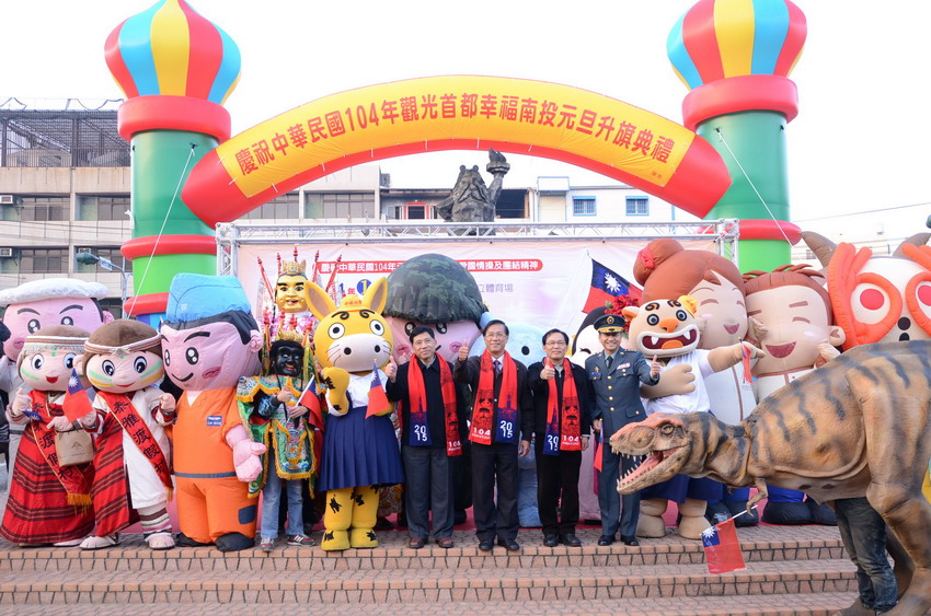 元旦升旗為展現本縣為觀光大縣,活動現場特別邀請縣內各大吉祥物,包含恐龍寶寶、妖怪村、泰雅渡假村、18度C巧克力工坊、茶二指故事館、國軍寶寶、憲兵寶寶、鹿谷鄉寶興宮神童等人偶,都來共襄盛舉,參加民眾也都爭相與人偶寶寶拍照,場面相當熱鬧。