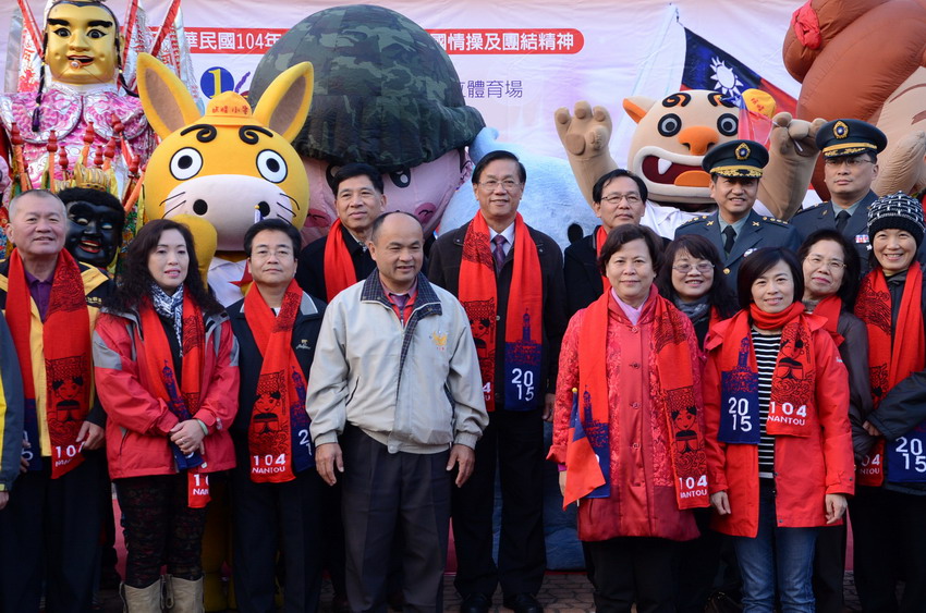 縣府慶祝中華民國104年元旦,1月1日上午6時30分在縣立體育場前廣場舉行南投縣104年觀光首都幸福南投元旦升旗典禮,在南崗國中樂儀旗隊壯麗的軍樂聲中展開,縣長林明溱與現場民眾一起高唱國歌,迎接新年曙光,期許縣民幸福平安。