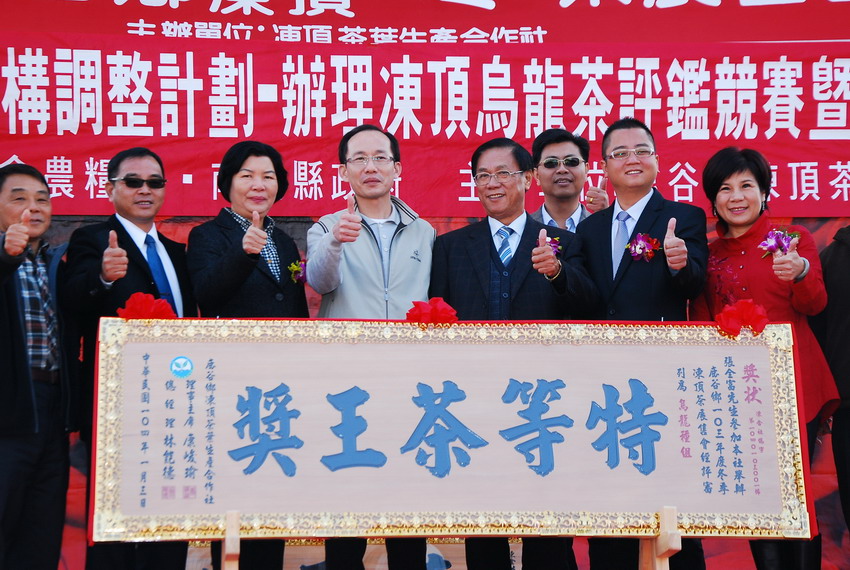 鹿谷茶香滿山飄,鹿谷鄉農會、凍頂茶葉生產合作社,元月3日分別舉辦冬季凍頂茶展售頒獎活動,茶農力拚獎項,賣得好價錢。鹿谷鄉農會得獎特等茶一斤要價30萬元,凍頂茶葉生產合作社的特等茶王則要價25萬元,好茶搶市,縣長林明溱肯定茶農努力,並希望南投茶銷售成績一年比一年好。 鹿谷鄉農會在該會茶葉中心舉辦103年度冬季高級凍頂烏龍茶展售會頒獎活動,吸引愛茶人士前往「嚐鮮」。 鹿谷鄉農會理事長曾文東表示,受天候影響,茶區降雨不足,今年冬茶產量較往年減少三成左右,平均茶價微揚,但參加農會冬茶比賽的茶樣十分踴躍,計有6288件,未入圍有2536件,佔了四成二三,競爭相當激烈,最後冬季高級凍頂烏龍茶特等獎,由張朝南獲得,一斤茶要價30萬元。 鹿谷凍頂茶葉生產合作社,則在鹿谷假日茶市舉辦冬季高級烏龍茶展售會頒獎活動,包括烏龍種組、新品種組參加的茶樣就有六千四百多件,其中張全富在烏龍種組脫穎而出,獲得特等茶王獎,陳金生獲茶王獎;魏丕訓也在新品種組獲特等茶王獎。 縣長林明溱分頭到各茶葉展售活動頒獎致詞,一一和展售的茶農握手致意,感謝茶農認真研發,及茶改場的協助,南投茶不但受到市場歡迎,也受到大陸市場青睞,未來縣府將配合各相關單位,大家一起努力,讓南投茶一年比一年好。 林縣長同時表示,鹿谷是南投產茶重鎮,每逢假日到溪頭的車輛,一路塞到鹿谷來,為解決地方交通問題,縣府正研擬解決方案,除爭取二億二千萬元,辦理小半天外環道路建設外,也希望拓寬溪頭溪坪到觀音樹湖道路,並興建停車場,解決地方問題。