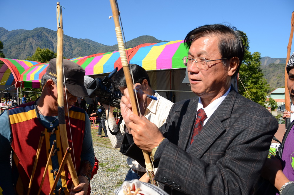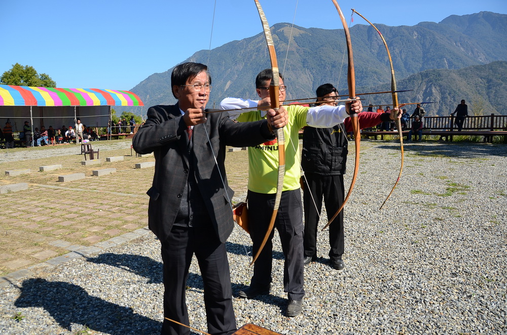 林縣長一抵達活動現場就受到熱烈歡呼,參賽選手不斷請林縣長在自己的比賽弓上簽名,林縣長也和主辦單位阿滵弩全人發展協會理事長伍勝華、花蓮縣政府秘書李光勝等人一起,體驗原住民傳統弓射箭樂趣。
