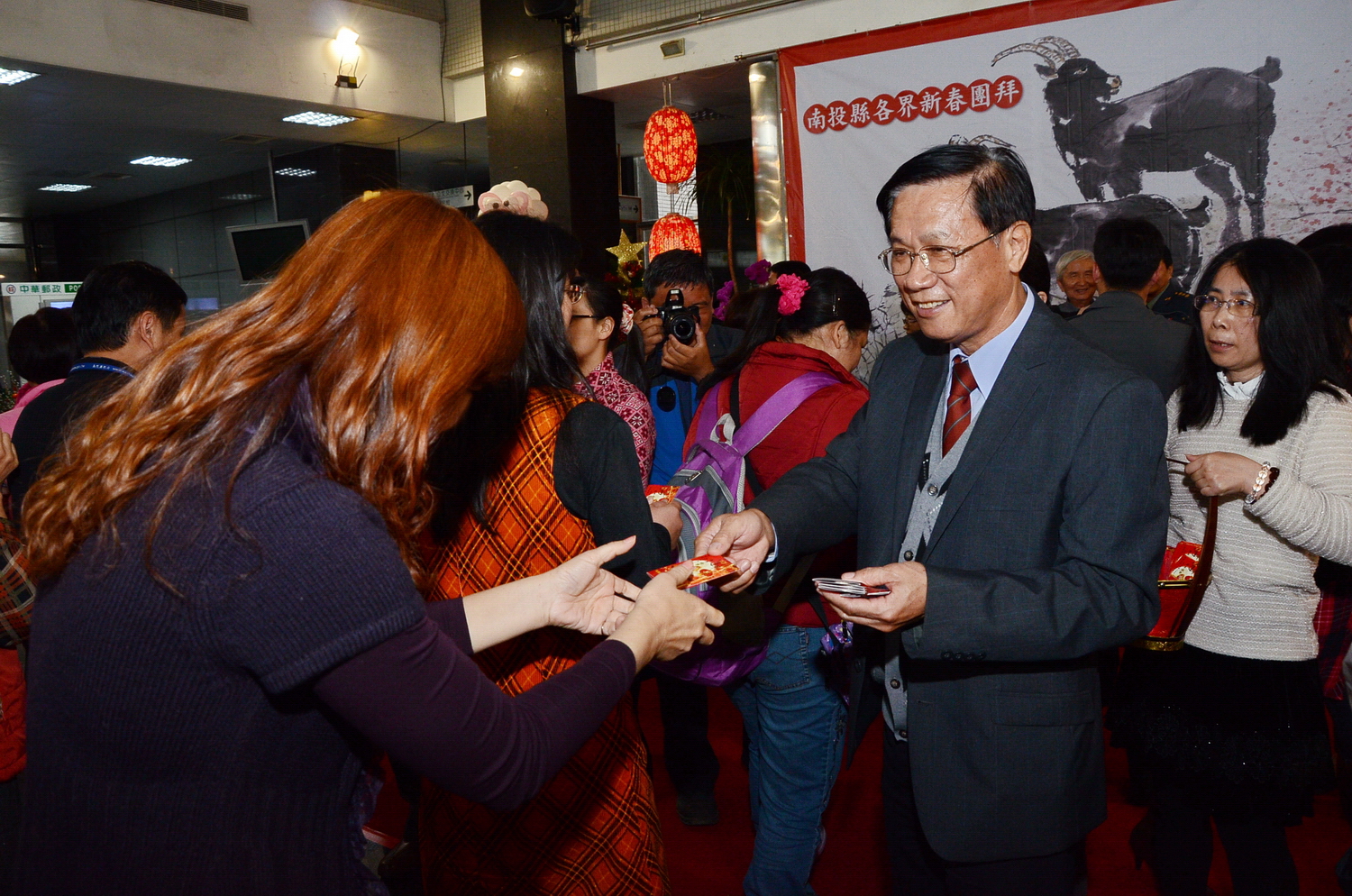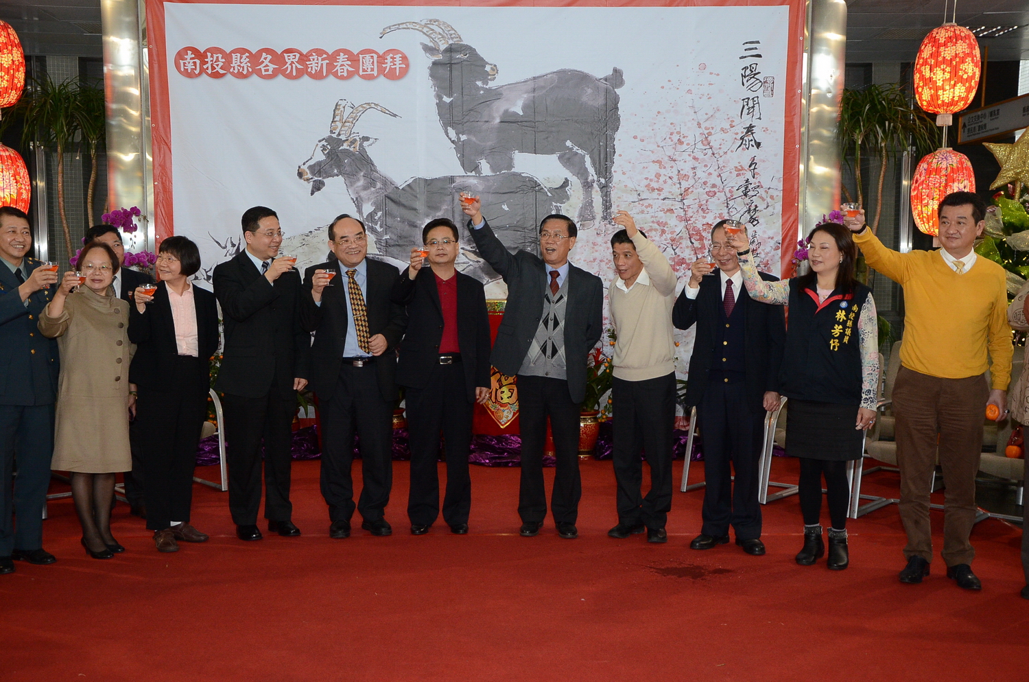 南投縣政府24日舉行南投縣各界104年新春團拜,是縣長林明溱就任後首次新春團拜,現場可謂冠蓋雲集,相當熱鬧。林縣長除祝福縣民羊年行大運、羊羊得意外,也勉勵所有主管不畫地自限,勇於跨越,在縣府財政不寬裕情況下,積極向中央爭取經費拼建設,為民謀福。