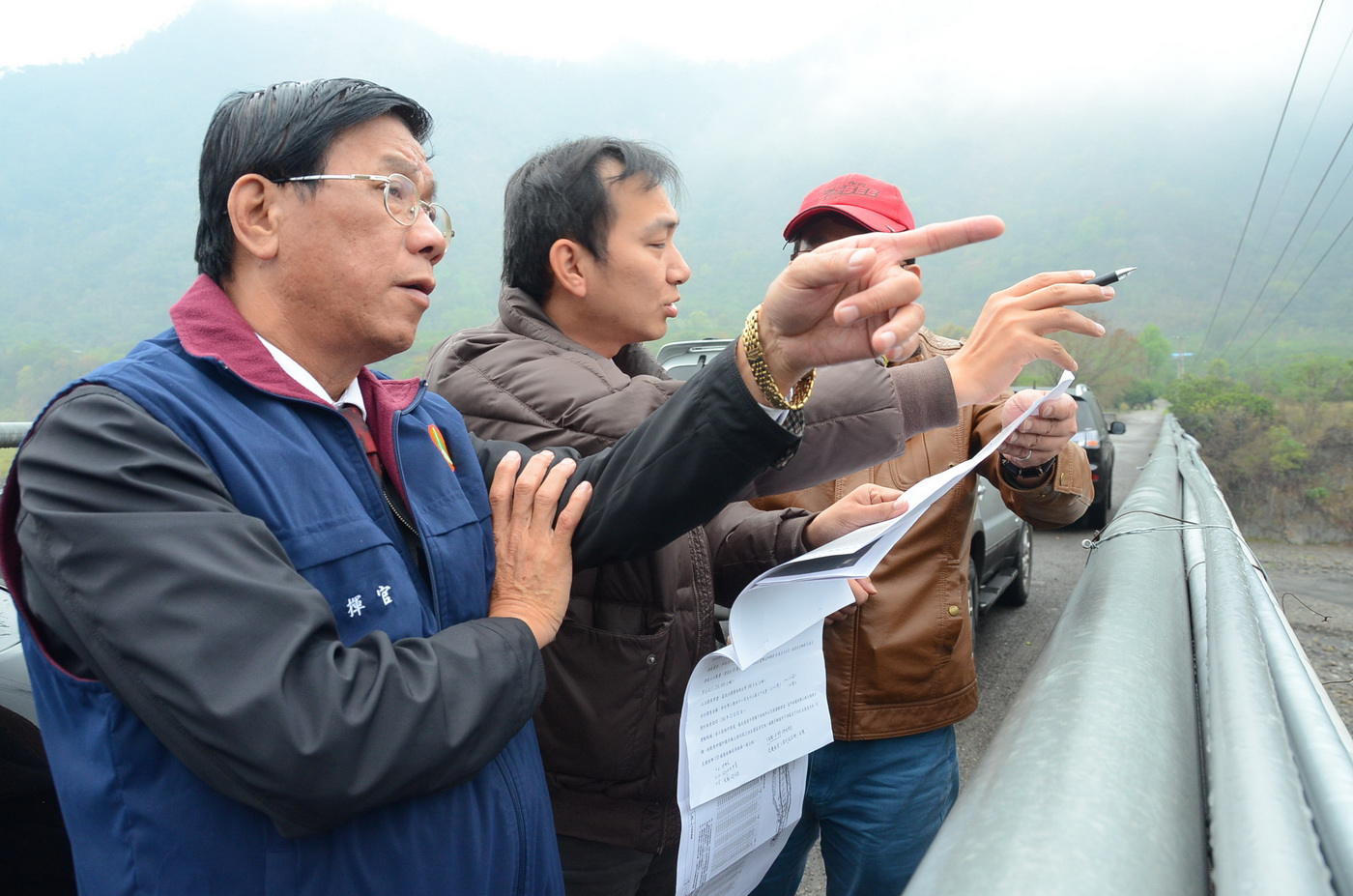 縣長林明溱10日下午前往仁愛鄉北港溪眉原橋及國姓鄉糯米橋會勘了解該河段砂石疏濬作業的進度,並指示盡速完成便道施做工程,儘快完成砂石疏濬作業。