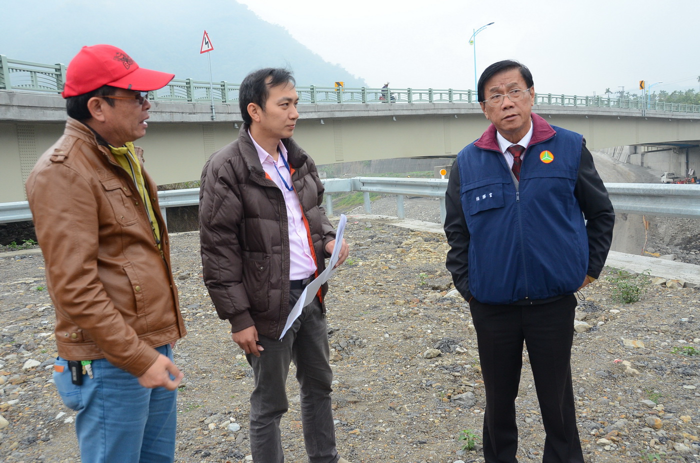 縣府目前已完成北港溪眉原橋下游河段疏濬工程的發包作業,預計3月底前完成工區便道的施作。林縣長特別到眉原橋上會勘施作工區河段的現況,聽取承辦人員簡報,並前往下游的糯米橋了解便道施作情形。