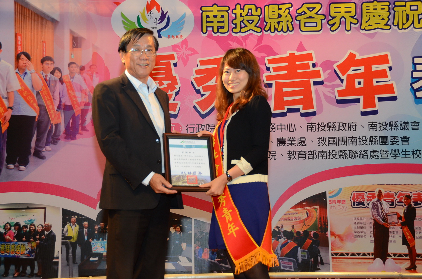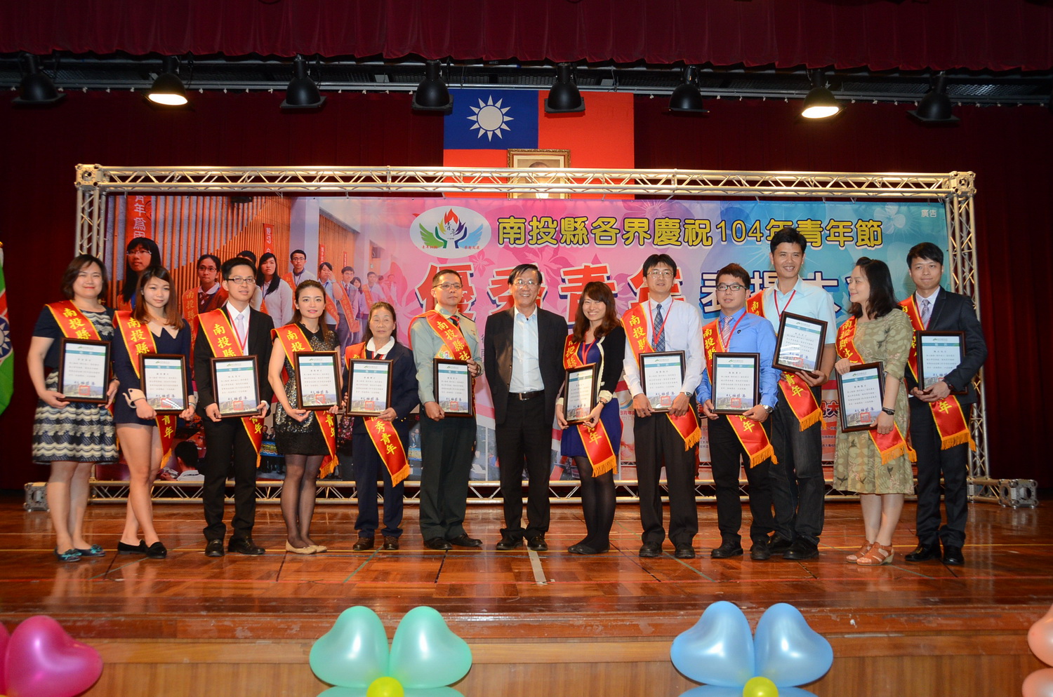 縣長林明溱26日出席在縣府大禮堂舉辦的「南投縣慶祝104年青年節優秀青年表揚大會」,除一一頒獎表揚給23位社會優秀青年及50位國高中優秀學校青年代表等共73位優秀青年,並合影留念,過程簡單隆重。