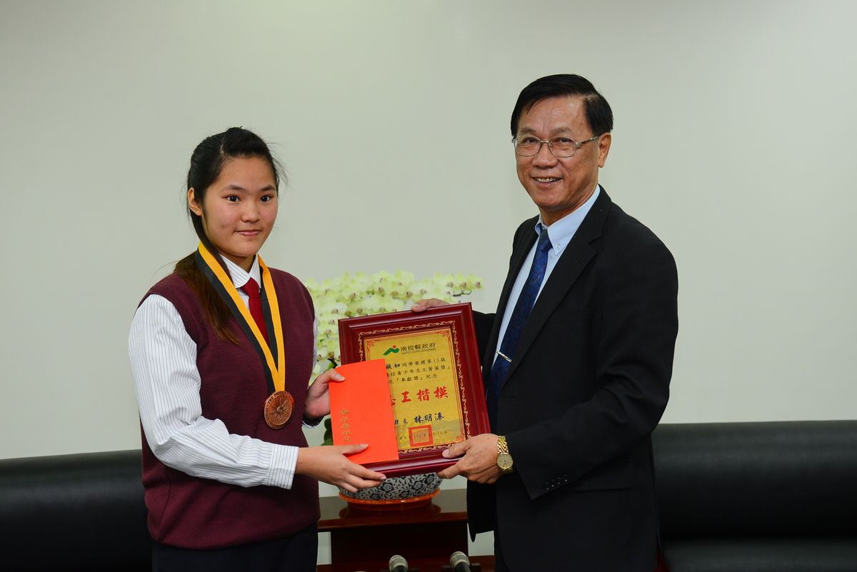 埔里高工林明俐在家人陪同下也到場接受縣長表揚,爺爺、奶奶及父親都為孩子助人的表現深感榮耀。林明俐說,小時在安親班安排下,便經常前往療養院陪伴老人,因此建立服務他人的志向,現在也經常帶領小朋友參與夏令營活動,並熱心於產業文化課程及烹飪,樂於分享給別人。
