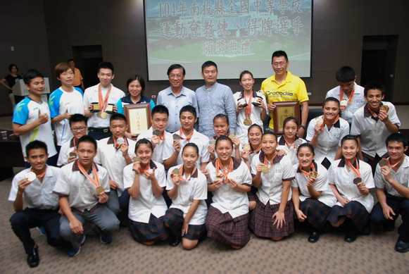 南投縣體育會下午在縣議會舉辦104年全國中等學校運動會得牌選手、教練慶功贈牌活動,為得牌選手加油打氣,林明溱縣長參加活動宣布好消息,已經批准金牌運動選手獎勵金,由7萬元調高至10 萬元,選手們聞訊感到高興,抱以熱烈掌聲。