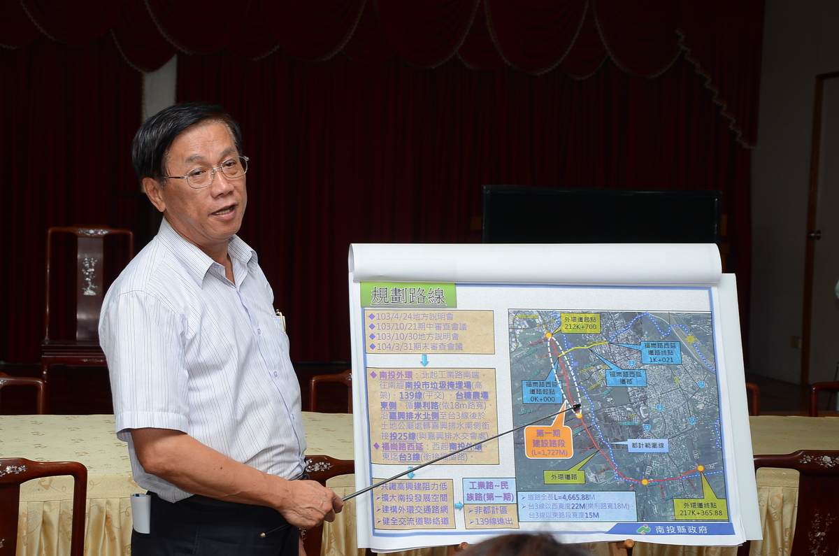 至於南投市工業路至民族路的南投外環道路新建工程,主要是要紓解台3線的交通,擴大南投市的發展空間,這條外環道路總長4.6公里,北起工業路南端往南經過南投市垃圾掩埋場、139線後循樂利路沿著嘉興排水北側至台3線後接到投25線,將分年分期完成,另外也計畫從南投外環道路新闢福崗路西延路線來連接台3線。林縣長指出,此案已經完成規畫,目前正在進行環境影響評估。林縣長與陳部長於慈善宮聽取簡報,縣議員蔡宗智、簡賜勝及地方人士也都到場表達支持。