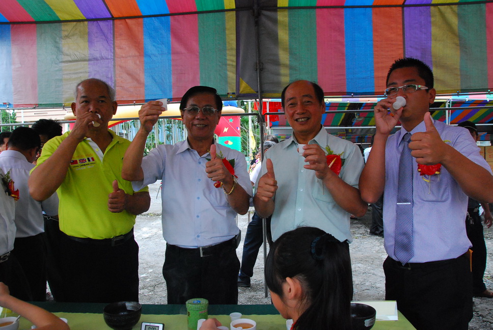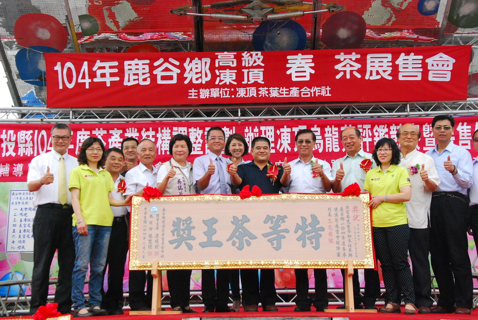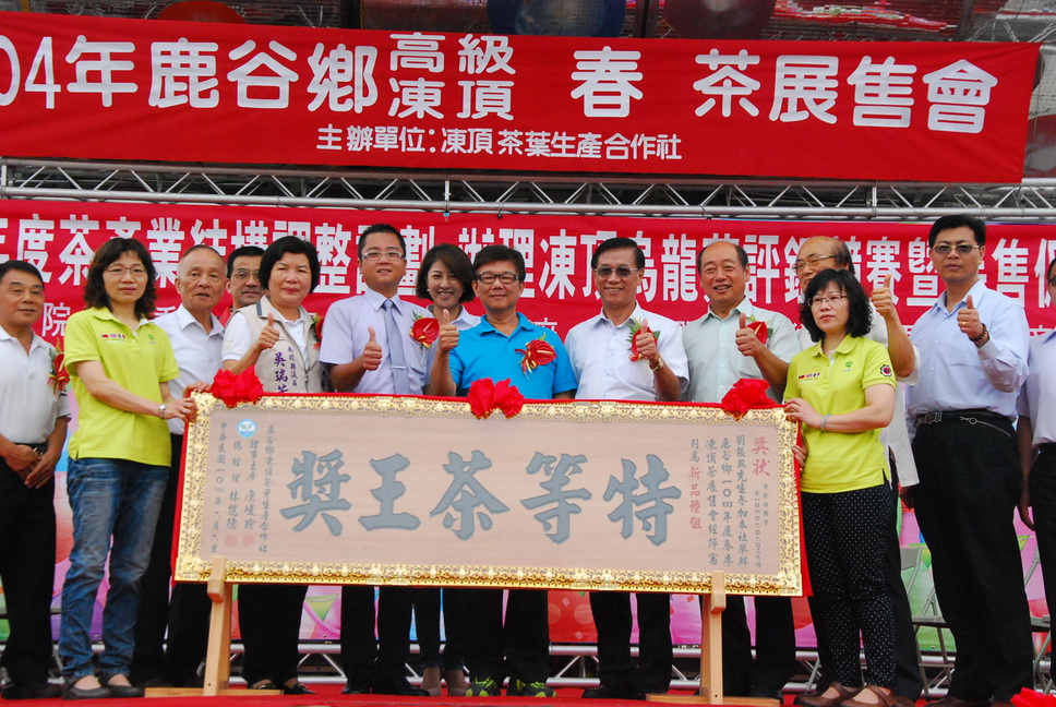 隨後,林明溱參加凍頂茶葉生產合作社春茶競賽展售活動,頒發特等茶王獎匾額給陳宏安、劉振興得茶葉競賽得主,並品嚐現泡的烏龍茶,頻頻稱讚。