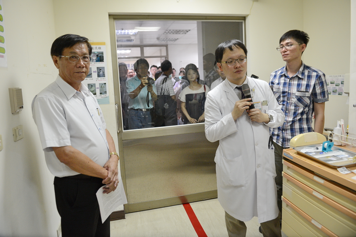 隨後,所有參與演練人員前往急診室前及負壓隔離病房觀摩,了解隔離動線與防疫措施。演練主要模擬疑似感染MERS的病人送往南投醫院,經急診室受理後,救護車直接把病人送進負壓隔離病房,救護車在病人前往病房後立即進行消毒。身著隔離衣的醫護人員則進入病房內為患者進行抽血、X光檢驗等檢查措施,器械使用完畢後立即消毒或拋棄。演練中,林縣長也在一旁觀摩,並感謝醫護人員的努力。