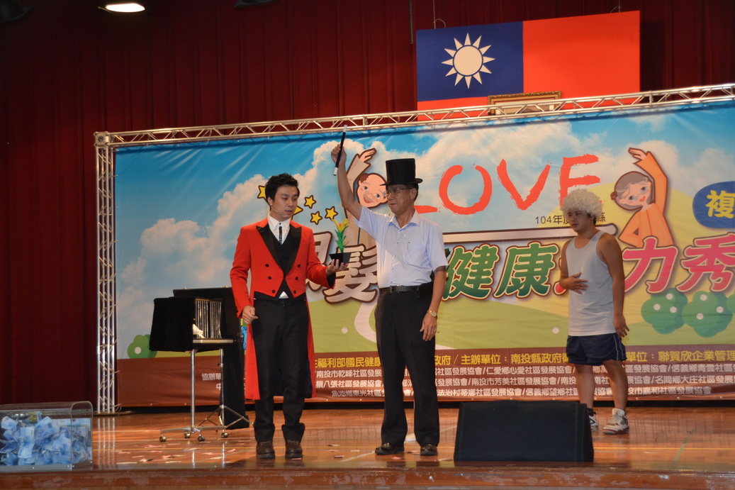 南投縣104年度銀髮舞動阿公阿嬤健康活力秀大賽複賽18日上午在縣府大禮堂歡樂登場,由縣長林明溱主持,初賽入選的15隊社區發展協會帶領著社區中的阿公阿嬤出席參賽,爭取代表本縣參加全國大賽的榮譽,各隊中共有13位超過90歲的長者參賽,其中以名間鄉大庄社區95歲的蔡張剪女士年紀最長,阿公阿嬤們個個用心展現幾個月來的努力成果,表演內容充滿活力和創意,氣氛歡樂,場面相當熱鬧。 林縣長表示,縣府不但相當重視老人福利政策 ,更重視老人的健康,為了鼓勵65歲以上長者健康動起來、快樂過生活,縣府每年都會舉辦這項活動,除凝聚社區向心力外,也激發銀髮族的創意活力與學習力,更能帶動高齡、獨居與失能長者的參與,藉以培養出互相扶持和支持的情誼,同時透過練習也能達到運動及健康促進的功效,讓銀髮族身心健康,再創生命價值,非常有意義,值得推廣,也企盼鄉鎮公所一起來參與。今天參賽的15隊中將會選出前3名代表本縣參加全國大賽,希望大家都能使出全力爭取佳績。 林縣長也表示,就任以來積極下鄉舉辦縣民時間聽取鄉親的意見,目前已展開第2次巡迴,鄉親參與相當踴躍,陳情的案件也很多,顯示鄉親對縣府的肯定與支持,雖然縣府財政困難,但縣府團隊也會積極開發財源,爭取疏濬、國有地活化等更多收入來推動更好的施政,像老人乘車提高到1000元,學童營養午餐等政策,未來縣府團隊會更認真來推動縣政,讓縣民有感。他也以日前車禍受傷為例向與會長者宣導交通安全觀念,他說,坐車一定要記得繫好安全帶,以策安全。 當天除林縣長伉儷外,縣議員史清水、賴燕雪及立委馬文君服務處主任黃世榮都到場致意,草屯鎮公所也派員出席。史議員和賴議員同聲肯定林縣長重視銀髮族照顧與福祉,積極推動各項老人福利措施,讓本縣銀髮族都能活得既健康又有尊嚴。 活動由魔術師黃俊傑的主題秀拉開序幕,林縣長也巧扮魔術師,一起同台演出,林縣長以魔術棒帶出美麗燦爛的花朵,聚焦全場目光,也象徵競賽活動開演,隨後精彩的活力表演陸續登場,各隊都展現練習成果,內容有太鼓結合舞龍,或用奶粉罐來伴奏,也有健康操結合韻律舞,五花十色精彩萬分,競爭相當激烈。