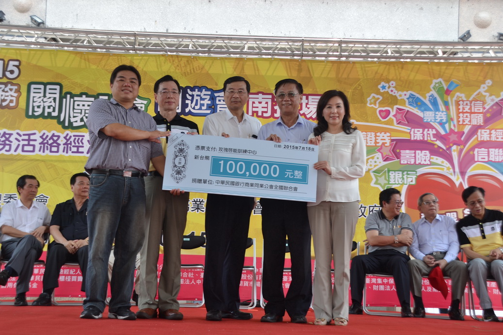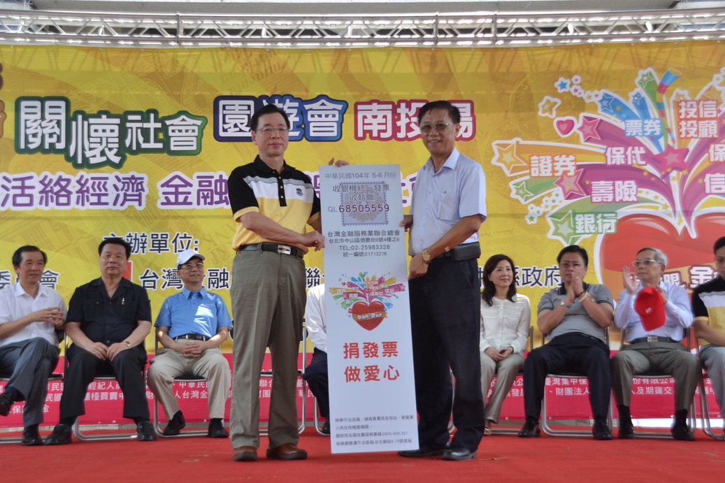 2015年金融服務關懷社會園遊會18日上午在南投縣立體育場廣場盛大登場,有金融、保險、證券、社會福利團體及農產美食等140多個攤位參加,當天活動只要用5張5~7月發票就可換取園遊券,吸引許多民眾前來參與,場面相當熱鬧,活動中,台灣金融服務業聯合總會理事長代表捐贈活動收集的發票予縣府,由縣長林明溱代表接受並回贈感謝狀,銀行公會等10家金融服務機構也共同捐贈100萬元予本縣10個弱勢團體,林縣長也代表受贈機構、團體表達感謝之意。 林縣長表示,台灣金融服務業聯合總會理事長李述德今天特地帶領金融服務業到本縣辦理金融服務關懷社會園遊會,宣導金融知識,並關懷弱勢族群,除了增進民眾金融相關知識外,也讓弱勢族群感受更多社會溫暖,活動相當成功。此次李理事長也號召銀行公會等10加金融服務機構共同集資新台幣100萬元捐贈給10個弱勢團體,每個團體受贈10萬元,讓他們在業務推動及弱勢照顧方面都能達到預期效果,特別代表受贈團體表達感謝之意。 金管會主委曾銘宗吳主委表示,鼓勵台灣金融服務業聯合總會舉辦此園遊會,主要是來關懷南投縣的弱勢團體,傳遞社會的關懷之意,其次是要宣導金融知識,讓民眾有更正確的金融知識和觀念,使其投資、風險控制都更有保障。 李理事長表示,該會在吳主委政策指導下,特別會同金融服務業會員來舉辦這場園遊會,希望透過園遊會方式宣導金融知識及常識,讓民眾對銀行、保險及證券期貨等都能有進一步了解,使個人理財、財務管理等各方面都能更到位,同時也藉此機會和南投縣的弱勢團體互動,並由該會所屬10個機構共同捐贈100萬元給10個弱勢團體,達到關懷社會、溫馨社會的目的。 活動中除捐贈發票外,也由銀行公會理事長李紀珠、證券公會理事長簡鴻文、壽險公會理事長許舒博、投信投顧公會理事長林弘立、證券櫃檯買賣中心董事長吳壽山、華南金控公司董事長劉燈城、合作金庫銀行董事長廖燦昌、期貨公會秘書長盧廷劼、票券公會秘書長許雙全、證券交易所經理單高年等將百萬捐款分贈給玫瑰啟能訓練中心、南投縣麻煩小天使協會、南投縣智障者家長協會、南投脊髓損傷者協會、復活啟智中心、南投市芳美社區發展協會、南投青年返鄉服務協會、南投仁愛之家、勵馨基金會及南投彩虹雙福協會等10個弱勢團體,受贈團體都同聲表達誠摯謝意,過程溫馨隆重。
