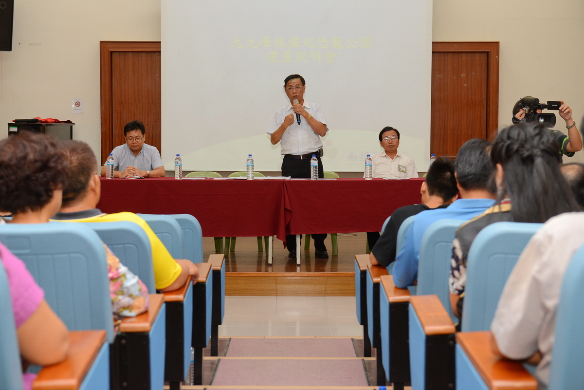 說明會中,首先由觀光處長王源鍾針對九九峰侏儸紀恐龍公園計畫進行簡報,他指出,該計畫主旨在於建置世界級綜合性公園,吸引優良廠商投資,除園區本身,也將與平林社區現有巷弄美學相輔相成,營造多元性旅遊市場。