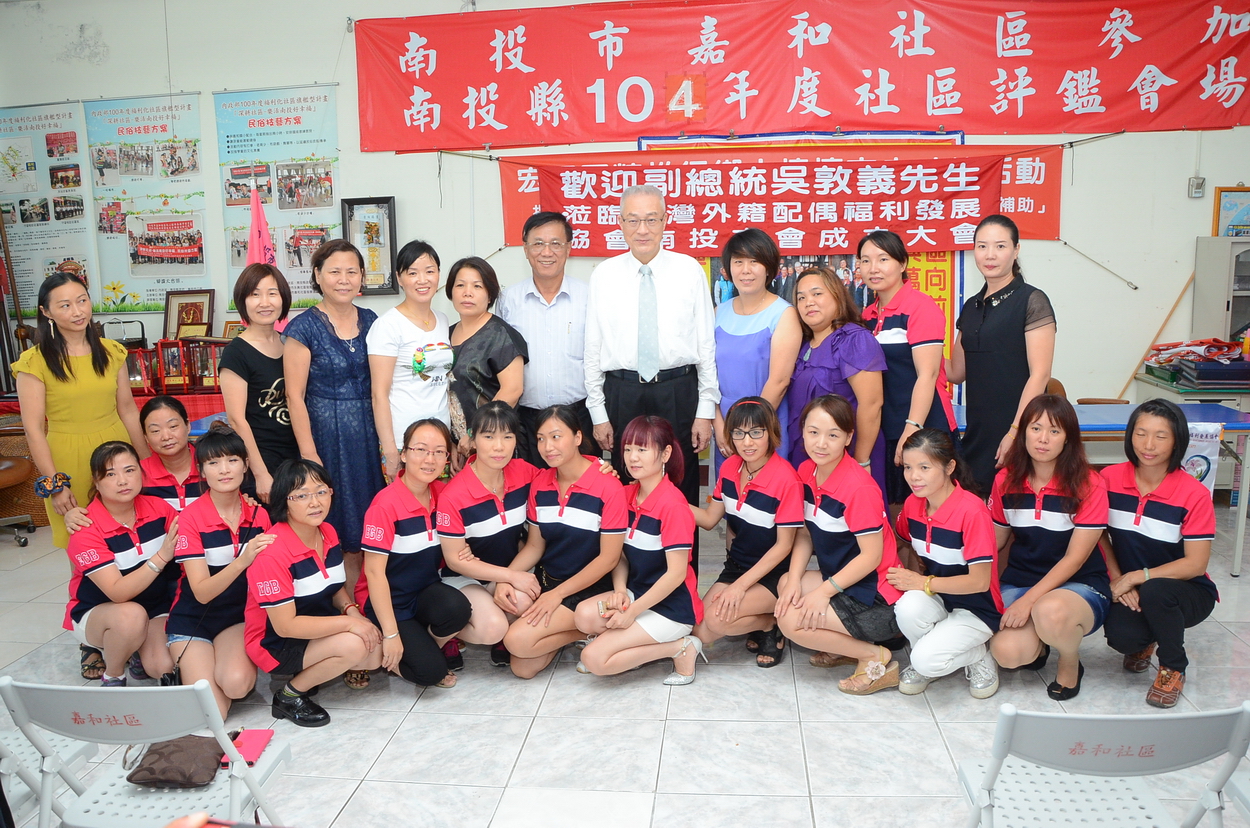 台灣外籍配偶福利發展協會今年3月成立後,第一個支會南投市支會26日也在南投市嘉和社區活動中心成立,副總統吳敦義、縣長林明溱、立法委員許淑華、南投市長宋懷琳、縣議員莊文斌、曾振炎等都到場祝賀。除鼓勵該會為縣內外籍配偶發聲外,吳副總統與林縣長也與會員、志工隊合影留念。