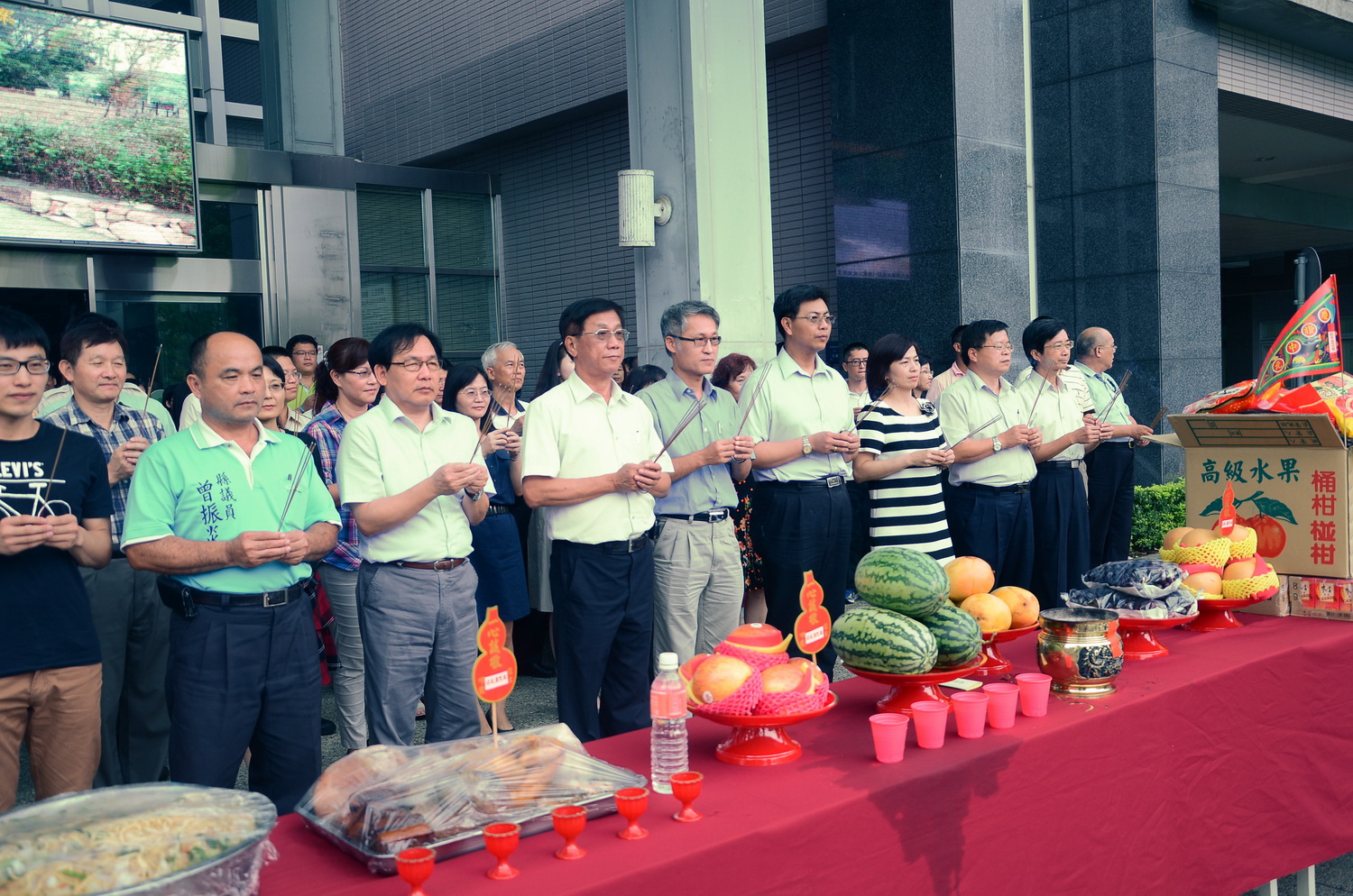 縣府配合中元節傳統節慶,昨(27)日依往例於縣府大樓門口,進行中元普渡祭拜活動,由縣長林明溱率領縣府一級主管及員工,以三牲果品、清酌香楮之儀祭拜「好兄弟」,除表達對陰間鬼魂的敬意外,也祈求縣政順利,縣境平安。