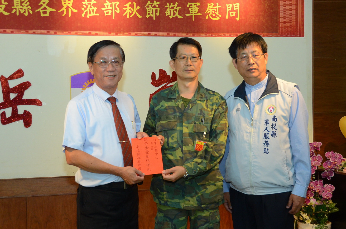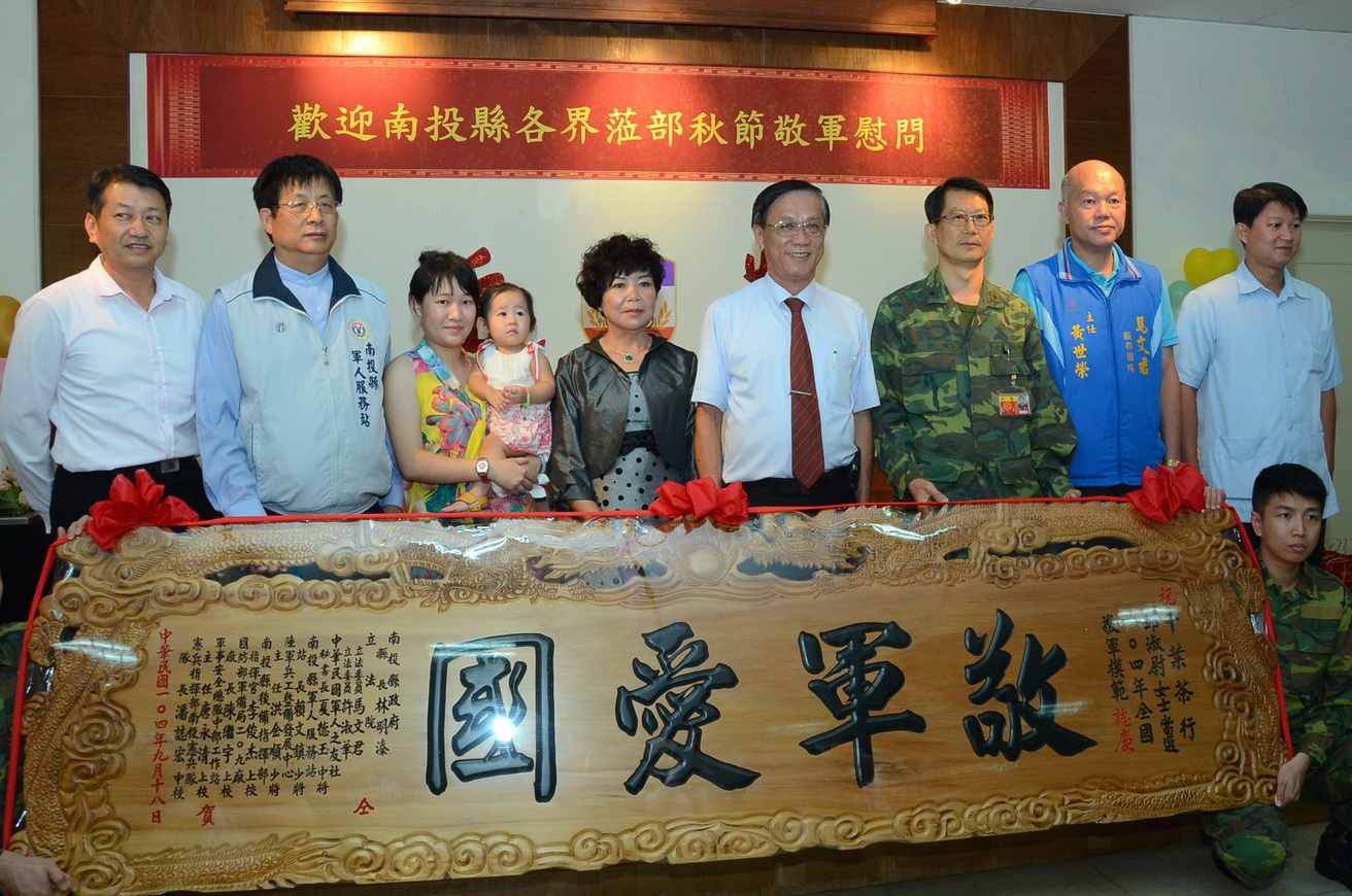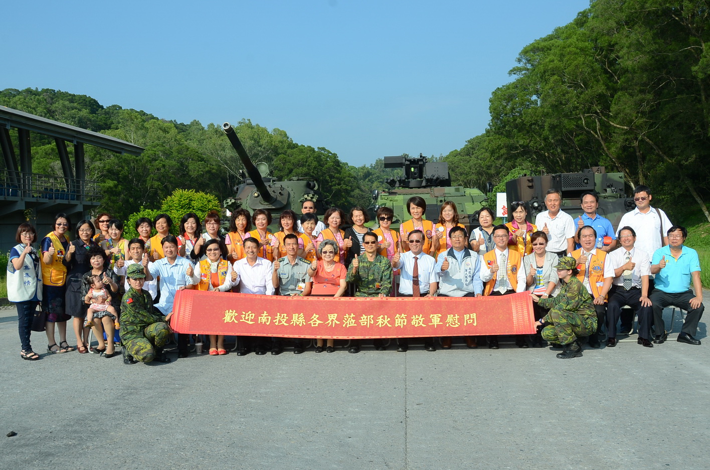 南投縣104年中秋節敬軍慰問活動18日在縣長林明溱的帶領下,前往集集兵整中心勞軍並致贈秋節加菜金,受到國軍官兵的熱烈歡迎,並合影留念。林縣長感謝國軍守家衛國與協助救災的辛勞,敬軍團也受邀參觀坦克車的性能操演,實地了解國軍戰備實力。 林縣長表示,南投縣多年來與國軍關係互動相當密切,他回憶起擔任集集鎮長,遭遇921地震後的各項救災工作,尤其是與兵整中心國軍官兵的協助和互動,至今讓他印象深刻,他特別表達感謝之意;值此中秋佳節,因很多國軍弟兄無法回家團圓,所以他特別代表縣府及南投縣各界致贈慰問金與加菜金,慰勞國軍弟兄保家衛國的辛勞,也感謝各界的參與。 兵整中心主任洪金順將軍則代表國軍歡迎林縣長與敬軍團的蒞臨,他說軍愛民、民敬軍,岳崗營區本著軍民一家精神,將會持續與縣府密切合作,落實各項防救任務。而南投縣軍人服務站站長賴文鎮將軍則感謝縣政府及各界社團、企業積極響應勞軍活動,以實際的行動來感謝國軍弟兄的辛勞付出。 勞軍團一行人來到集集岳崗營區,由兵整中心洪主任所帶領的各單位幹部代表接受各界致贈加菜金,林縣長並頒發「敬軍愛國」大匾額給榮獲全國敬軍模範的邱淑尉女士,肯定她的敬軍表現,隨後並前往訓練場參觀各式戰車操演。 本次參與勞軍的機關團體除了縣政府外,還包括集集鎮長陳紀衡、草屯鎮公所、竹山鎮公所、信義鄉公所、草屯鎮農會、南投縣愛心會、玉蘭獅子會、投美獅子會、南投縣進出口公會、婦聯會南投縣分會,以及多家民間企業公司代表。