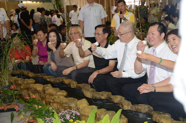 南投世界茶業博覽會,10月4日舉辦千人茶會,380個席湧入3千多名遊客品茗,副總統吳敦義到場和遊客共飲好茶。縣長林明溱說,茶博活動不斷創新,連台北市長柯文哲都跑來參訪,顯示縣府團隊的用心,他並預估今年茶博會遊客,將達三十萬人,縣府感謝各界參與,讓茶博成為盛會。 一年一度的南投世界茶業博覽會,不但是愛茶人士的最愛,政商名流也喜愛參與,第二天茶博活動,上午台北市長柯文哲到訪,下午副總統吳敦義也到場參加,名人加持茶博,增添不少活動話題。 副總統吳敦義,下午到中興新村虎山藝術館,參觀鬥茶協會世界茶業之旅,品嚐不同國家的青茶,吳敦義表示,茶再怎麼喝,還是台灣的最好,他並走入茶博攤商,和民眾熱絡互動,拍照合影留念,受到歡迎。 隨後,吳敦義由縣長林明溱、立委馬文君、許淑華,及農委會副主委陳志清等人陪同,前往青少年活動中心,體驗「曲水流觴」的喝茶意境,吳敦義副總統並在茶後呤誦一段古詩詞,「把酒祝東風,且共從容。垂楊紫陌洛城東,總是當時攜手,遊遍芳叢。聚散苦匆匆,此恨無窮。今年花勝去年紅,可惜明年花更好,知與誰同?」讓一同喝茶的人,感受不一樣的氣氛。 茶博會舉行的千人茶會,可說是活動重戲,三千多人坐在中興會堂大操場上,青青草原泡好茶,也吸引吳敦義副總統等人前往品茗,體驗日本茶道。 林明溱縣長感謝民眾的參與,南投茶博會舉辦六年來,己經建立口碑,不但副總統吳敦義參與,台北市長柯文哲也安排時間前來參訪,縣政府舉辦活動的能力,不斷在創新,也受到注目。