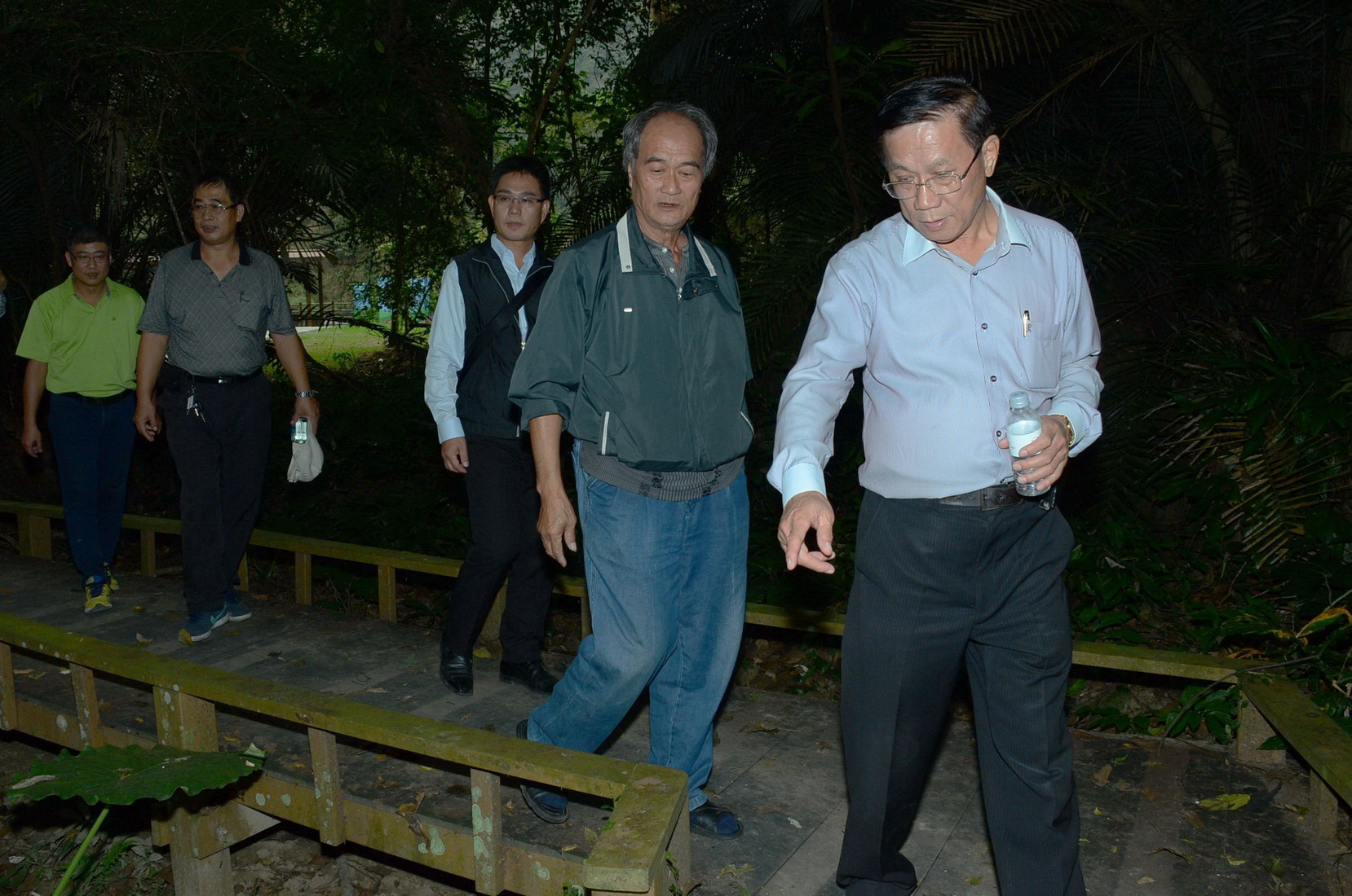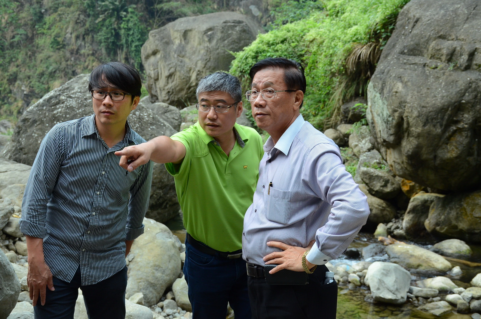 林縣長從瑞龍吊橋開始步行,沿途他相當仔細的觀察各項設施的完善與否,包括休憩涼亭增設桌椅、廁所加裝水塔、步道止滑條的加強等等,他也建議沿途綠地可種植肖楠木,並指示將瀑布下游處的溪邊雜石加以清理,堆置岸邊作為保護河岸之用,也能讓溪中流水匯聚成池潭,增加景觀。