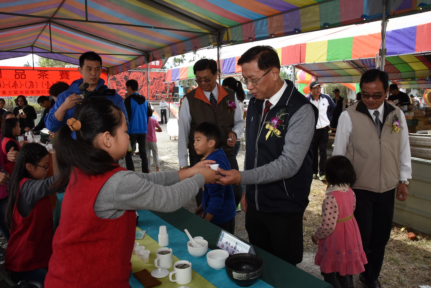 鹿谷凍頂茶葉生產合作社也特別在展售會現場,邀請鹿谷國小學生沖泡得獎的特等獎茶葉分享遊客,現場茶香四溢,林縣長和與會貴賓一一品嚐,讚不絕口。