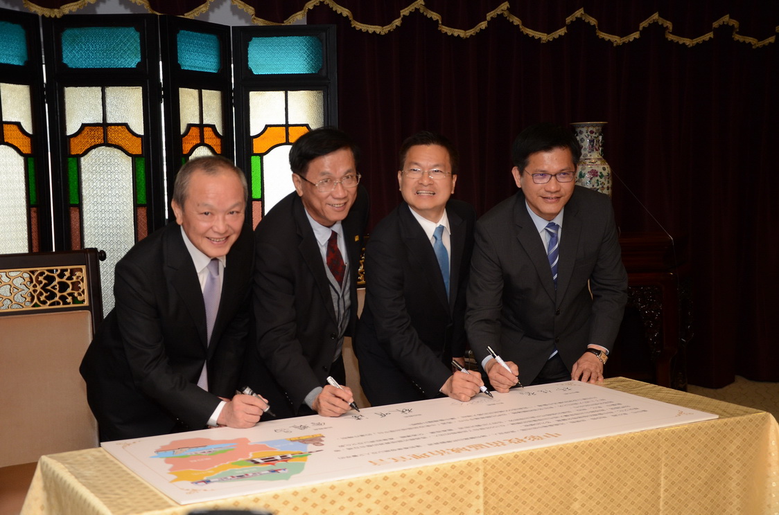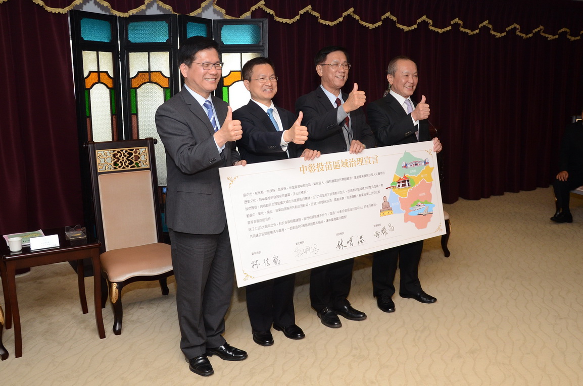 「中彰投苗區域治理平台」4縣市首屆首長會議5日在台中市政府禮賓廳舉行,南投縣長林明溱、台中市長林佳龍、彰化縣長魏明谷及苗栗縣長徐耀昌共同簽署「中彰投苗治理宣言」,開啟4縣市「跨黨派、跨議題、跨縣市」合作模式,針對人事、觀光、勞工及客家事務等層面深入探討,攜手實現中台灣崛起的共同願景。